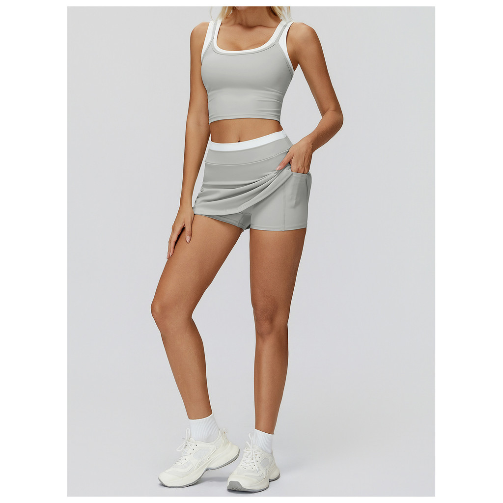 Nude sentir contraste cor saia cintura alta rosqueado falso saia esportiva de duas peças Anti-reflexo saia de tênis 3129