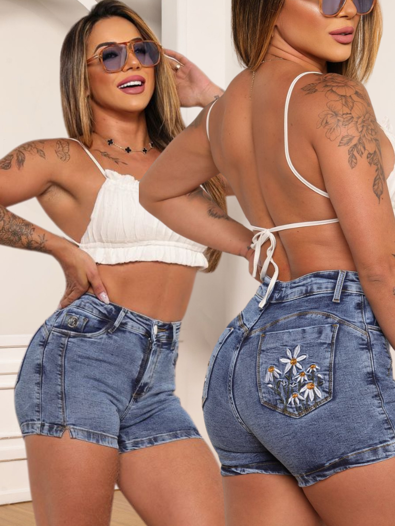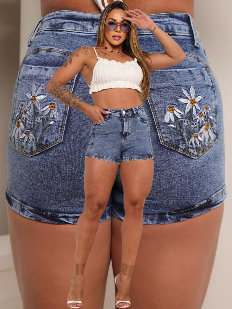 Short Jeans Feminino Marmorizado Cintura Alta Com Laycra Bordado Levanta Bumbum