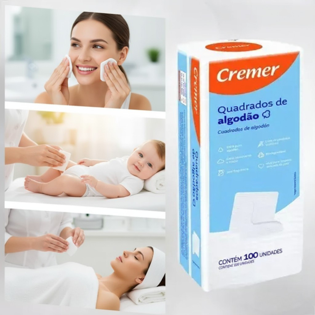 Kit com até 1200 Unidades Algodão Quadrado Sem Perfume Cremer 12 Caixas Bebê e Limpeza de Pele