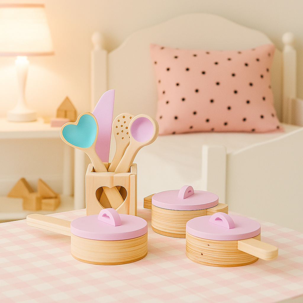 Kit Panelinhas e Utensílios de Cozinha Infantil em Madeira Rosa Brinquedo Educativo