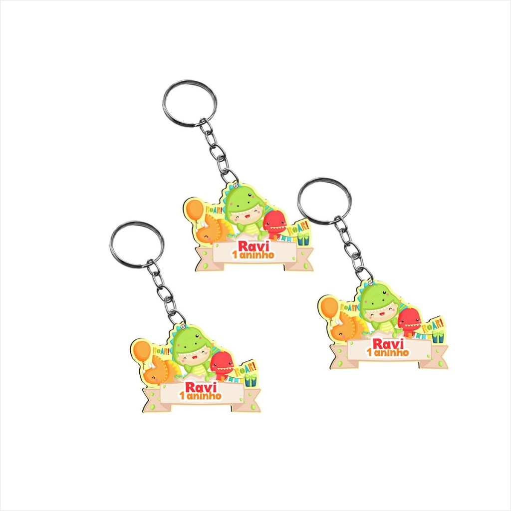 Chaveiro personalizado Dino Baby embalados com saquinhos transparentes.