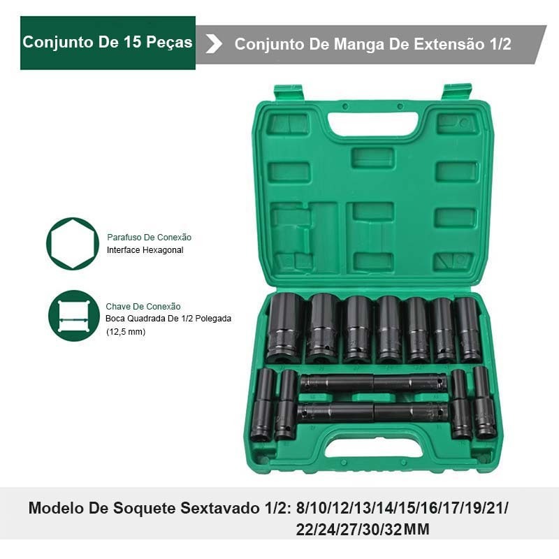 Jogo de Soquetes de Impacto 15 Peças 8 A 32mm para condução de parafuso em carros