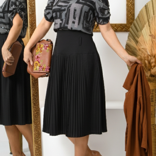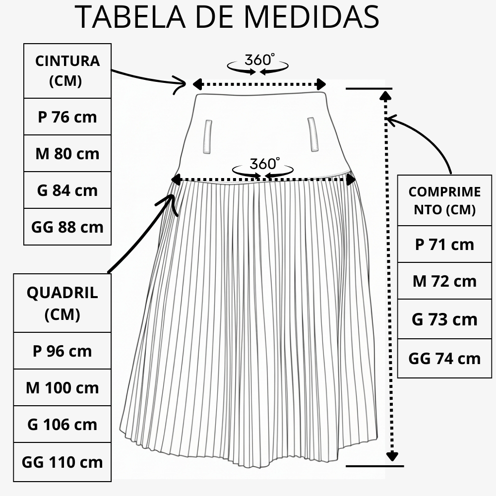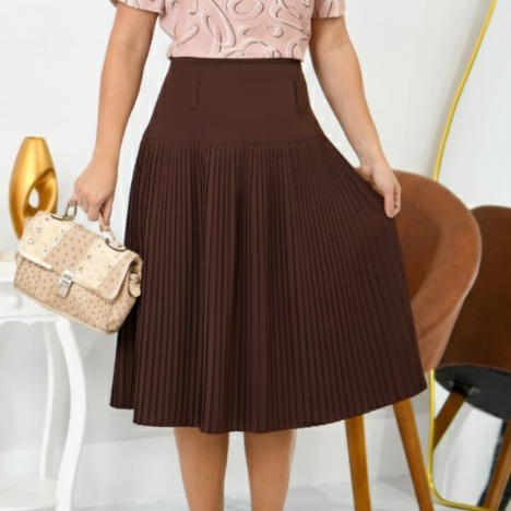 Saia plissada, saia mídi alfaiataria, saia rodado social, cintura alta, saia evangélica.