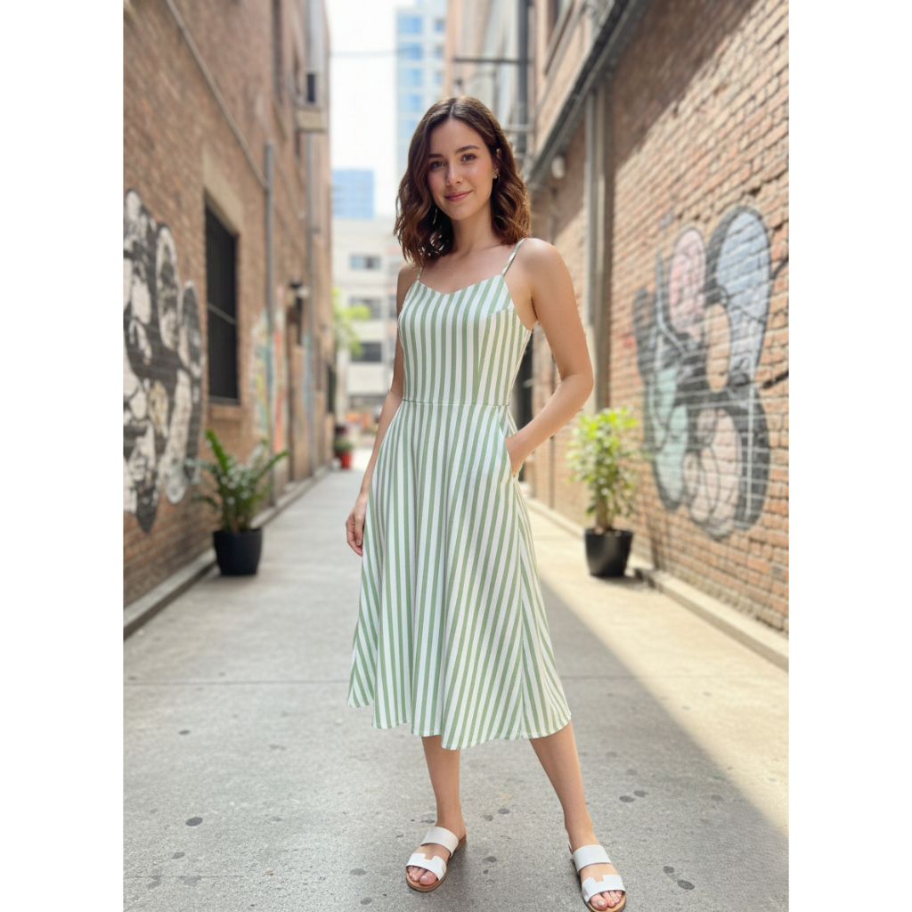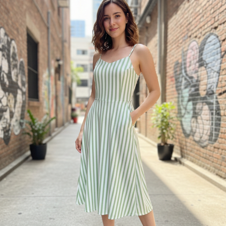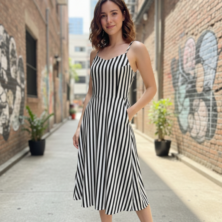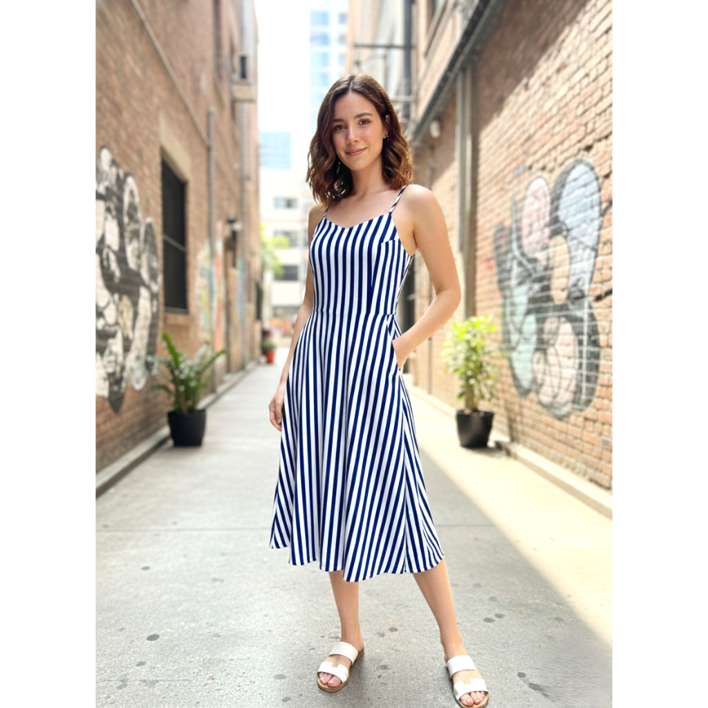 Vestido Feminino listrado Midi duna com bolso