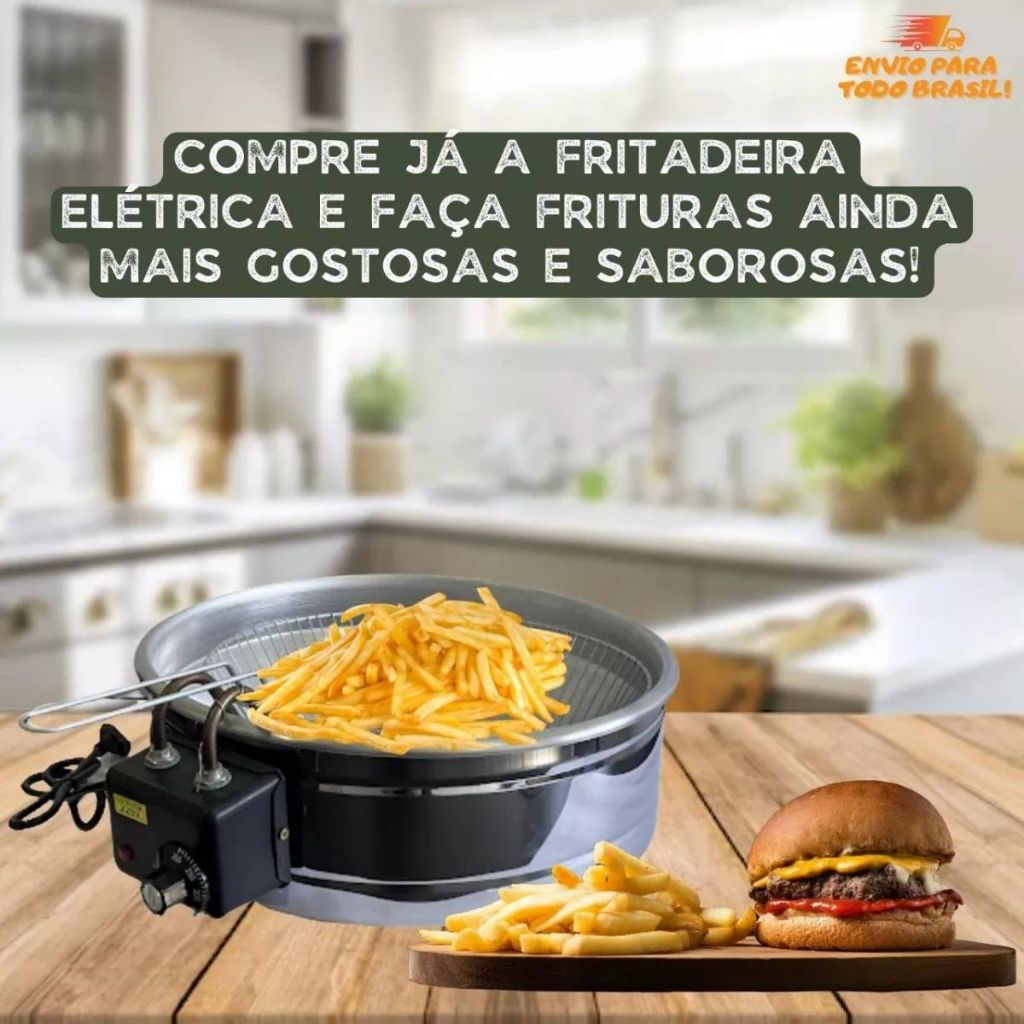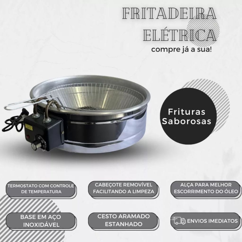 Fritadeira Elétrica Profissional 10L Tacho Redondo Aço Inox com Termostato e Cesto para Casa e Comércio