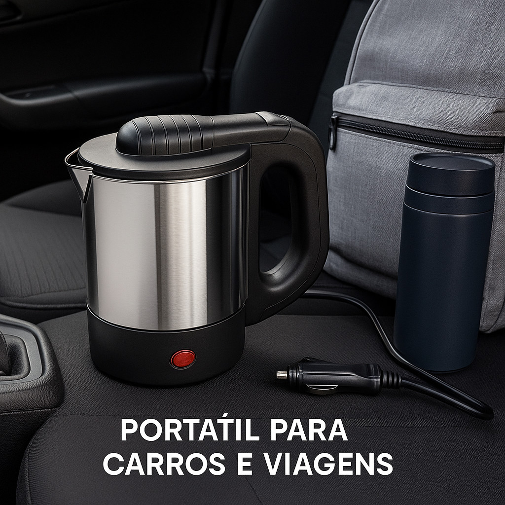 Chaleira Elétrica Portátil 12V p/ Carro 500ml – Inox, 125W, Veicular p/ Viagem e Camping