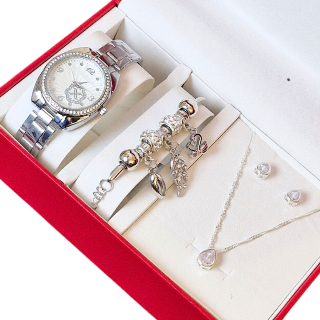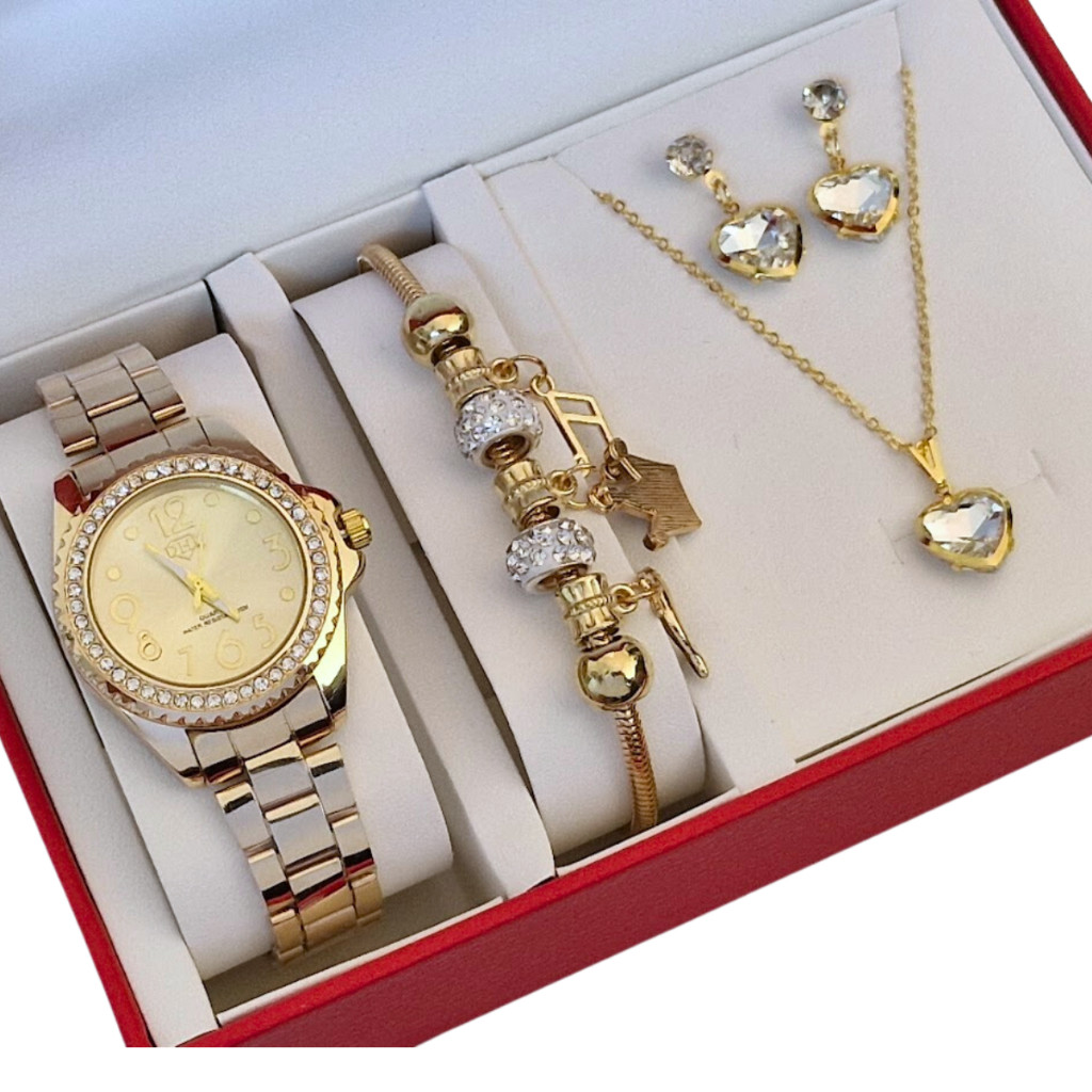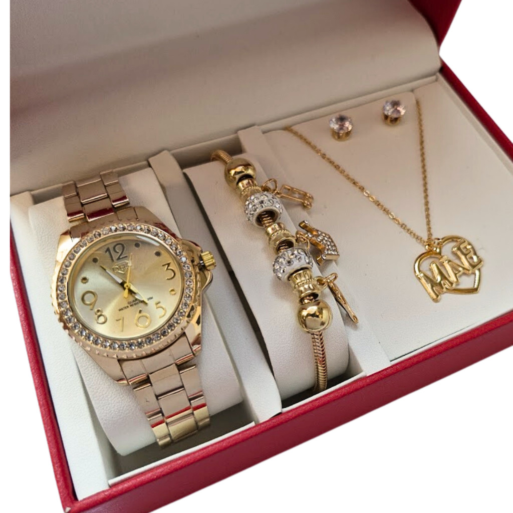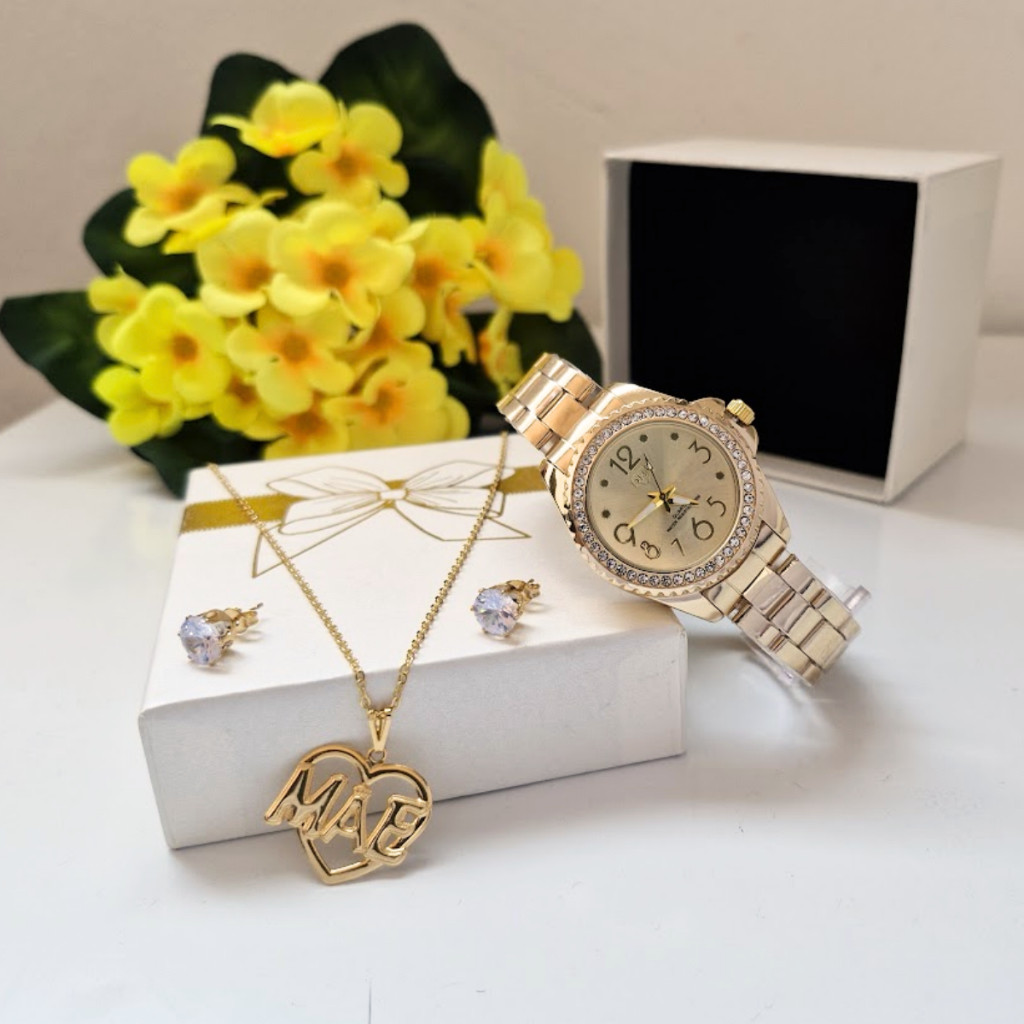 Relógio Feminino À Prova Água + Colar Brincos Folheado Ouro + Pulseira Feminina com Caixa - Presente dia das Mães