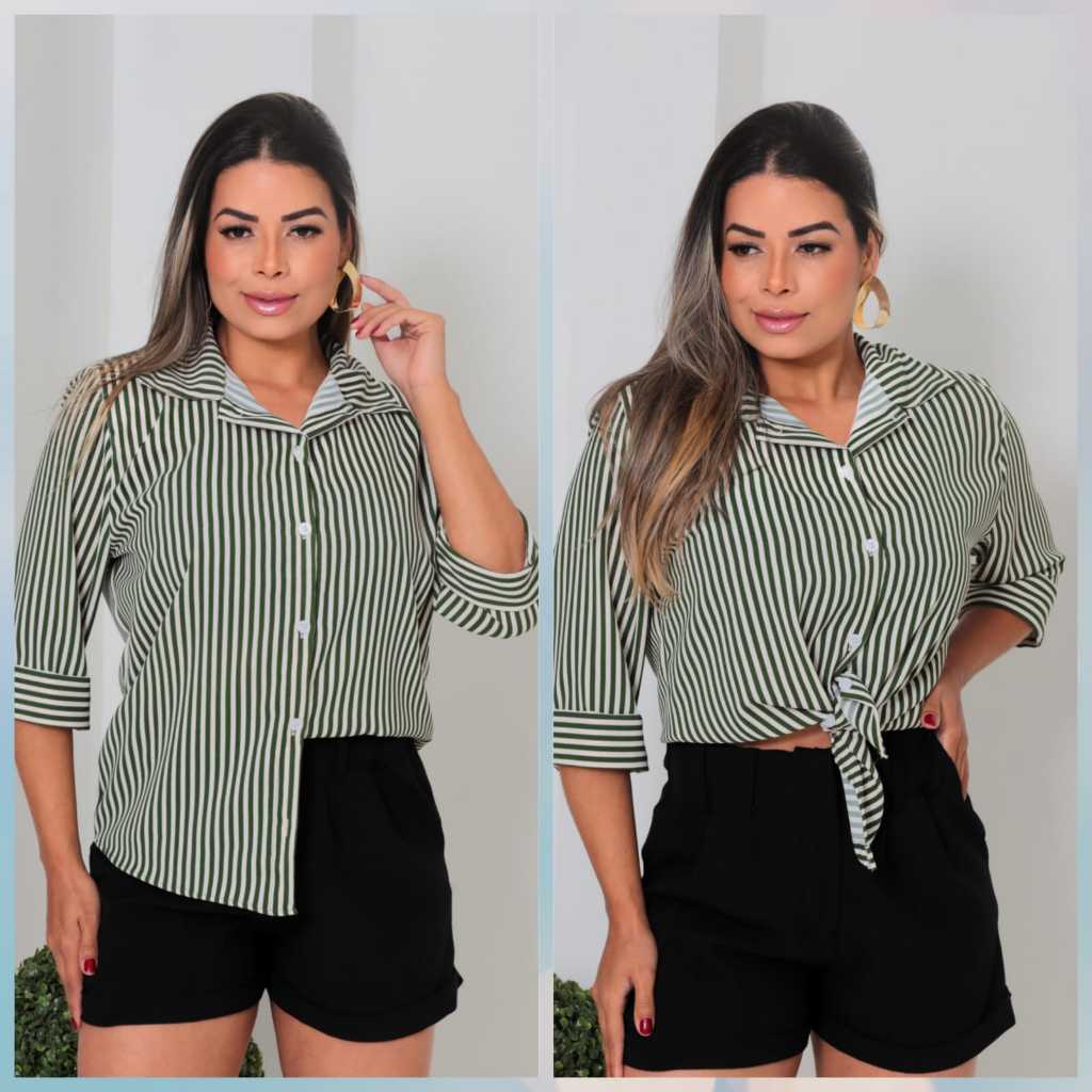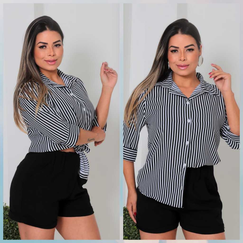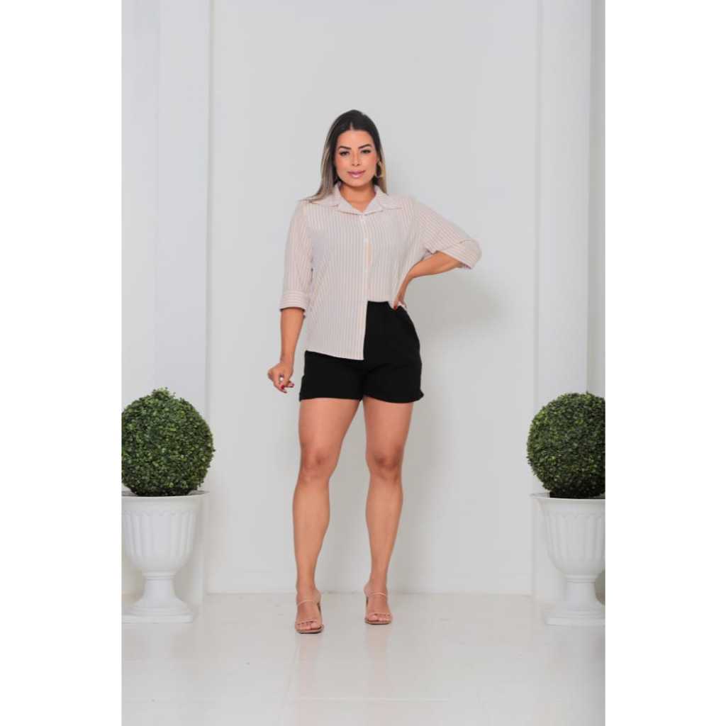 Camisa Feminina Crepinho Listrado Manga 3/4 Com Botoes