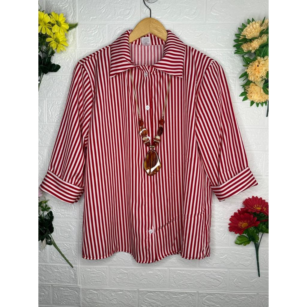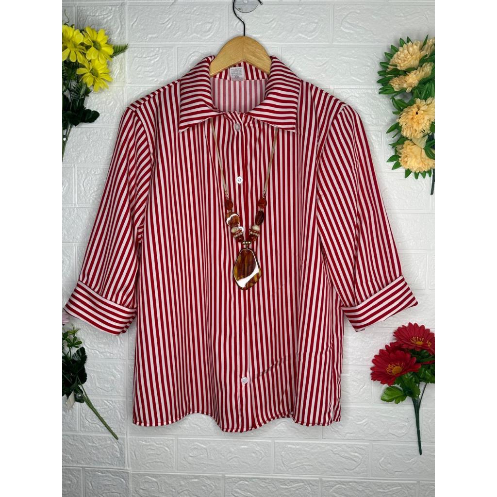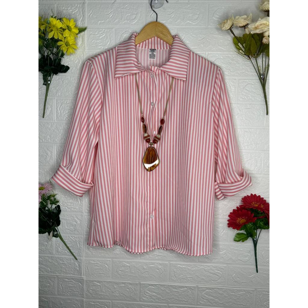 Camisa Feminina Crepinho Listrado Manga 3/4 Com Botoes