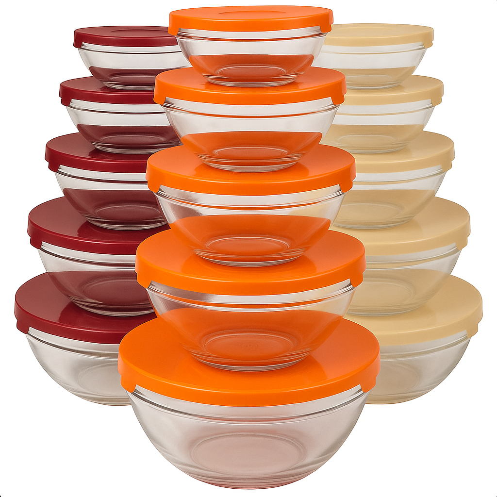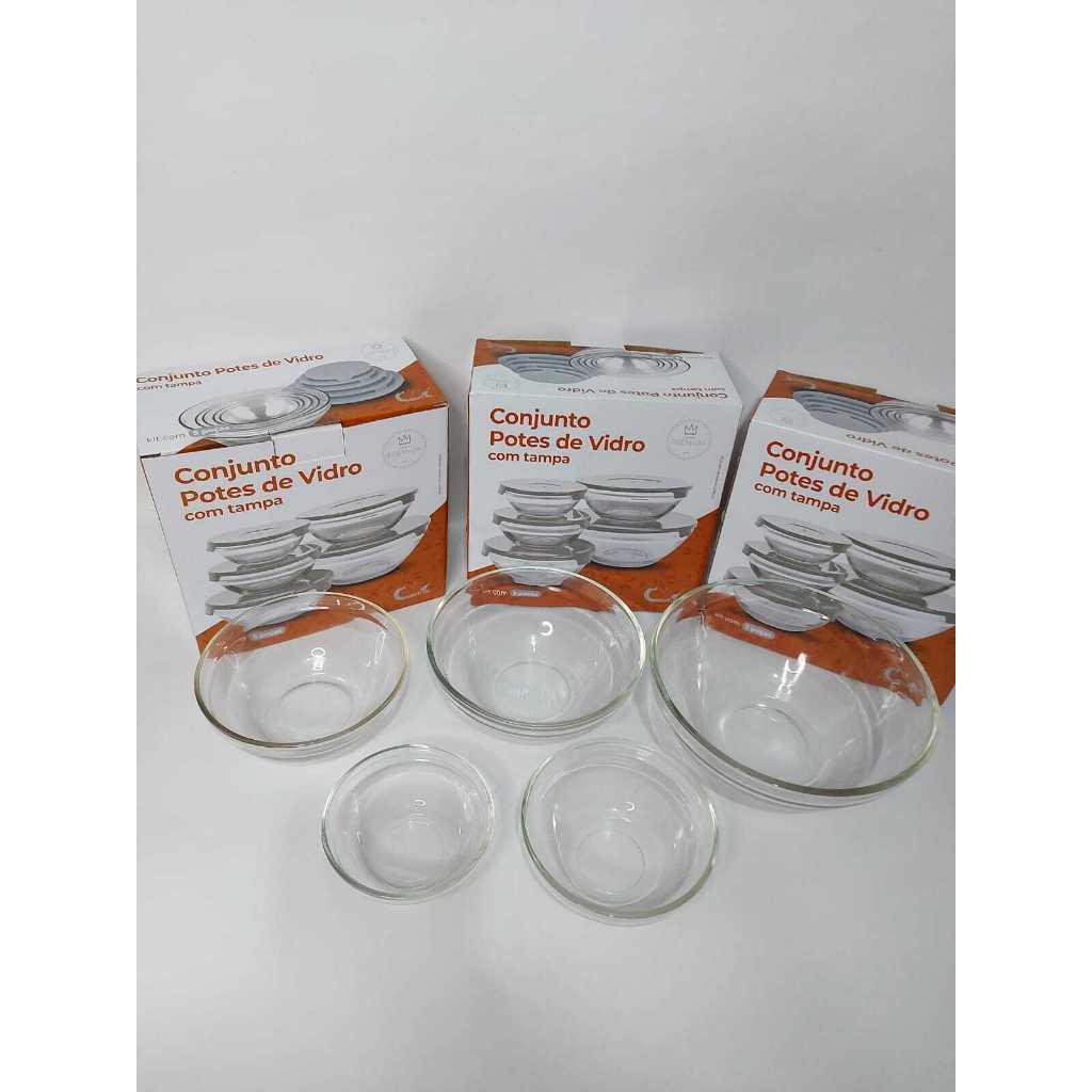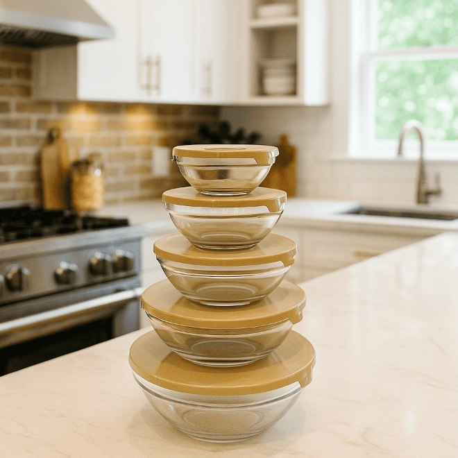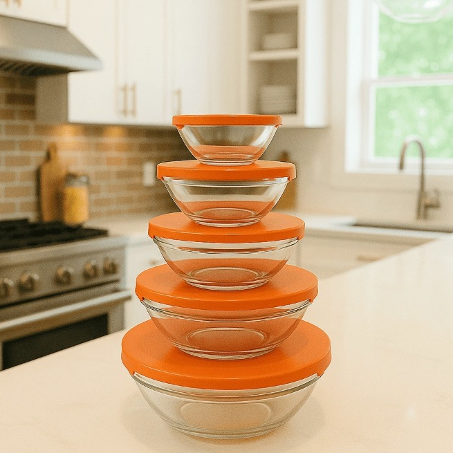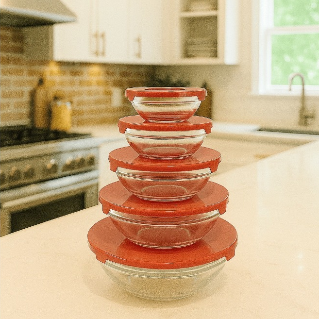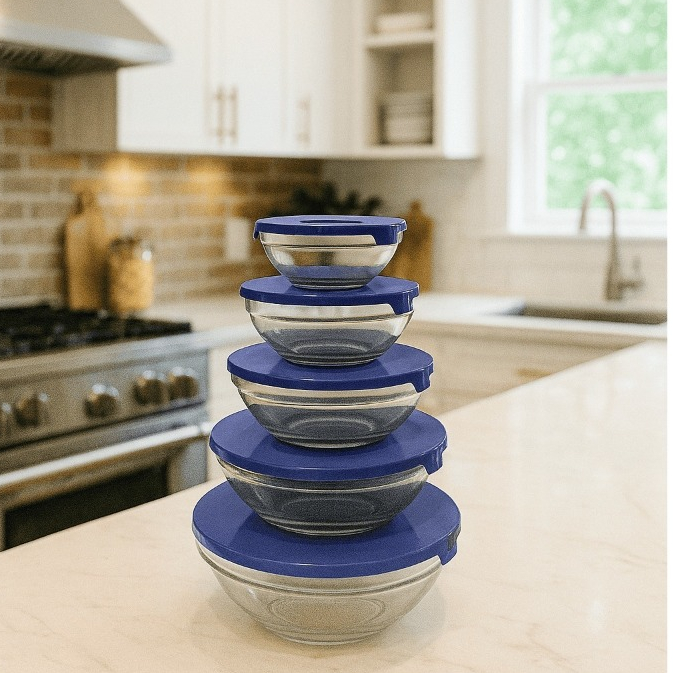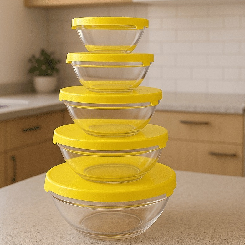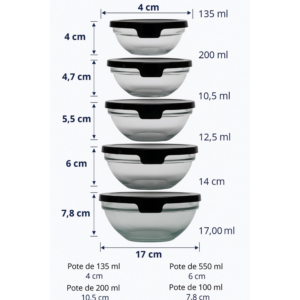 Conjunto de 5 Potes de Vidro com Tampa – Empilhável|Ideal para Cozinha, Marmita e Armazenamento