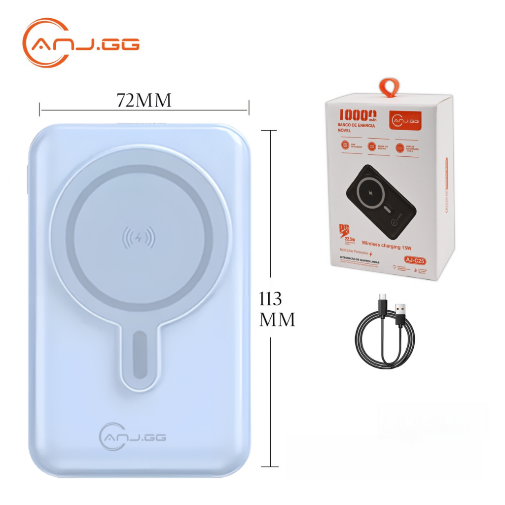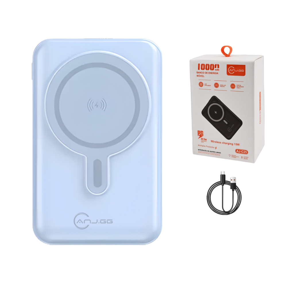 Power Bank Magnético 10000mAh com Suporte Dobrável e 3 Cabos Embutidos Azul