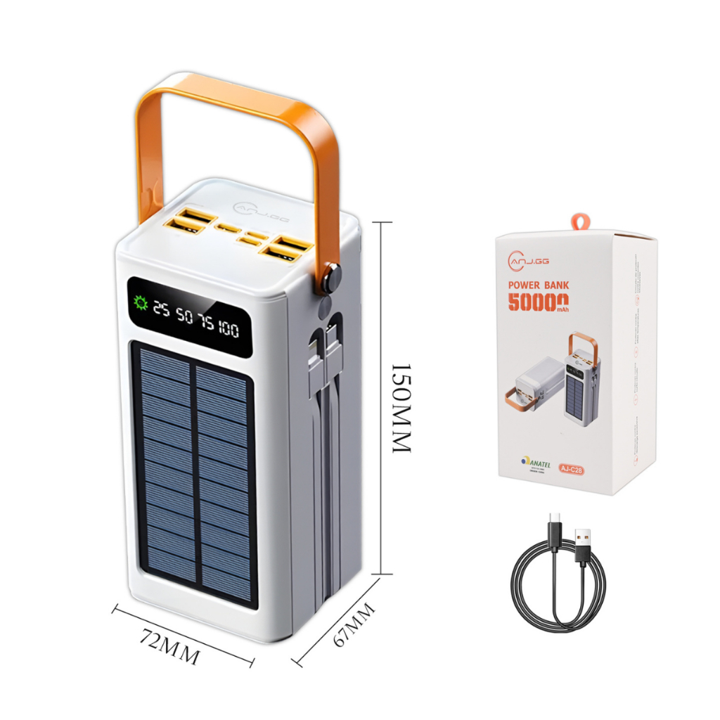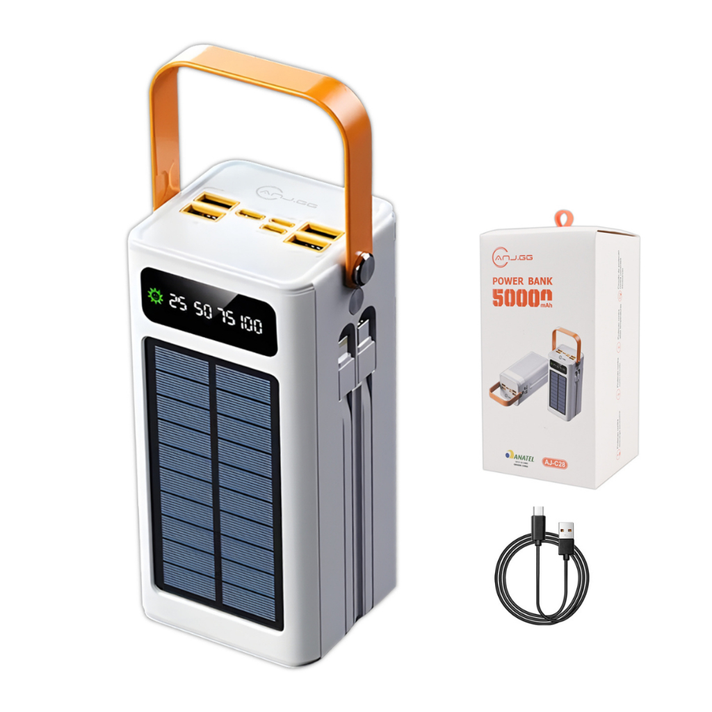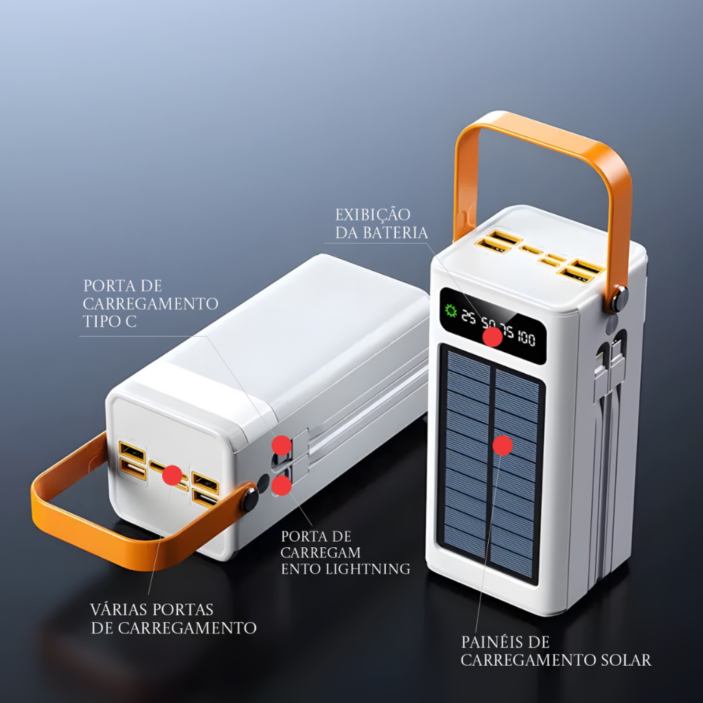 Power Bank Solar 50000mAh com 4 Portas USB Carregamento Rápido Bidirecional e Display Digital Branco