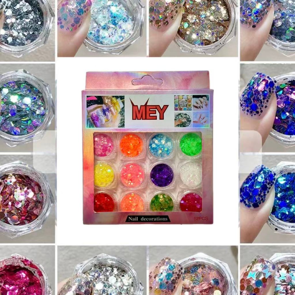 Kit de Glitter para Unhas MEY 12 Cores - Brilho Intenso para Carnaval e Festas de Verão 2026