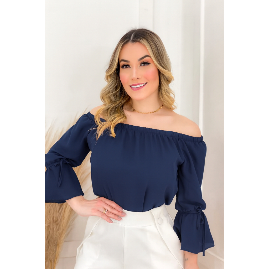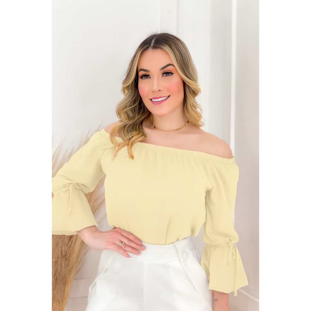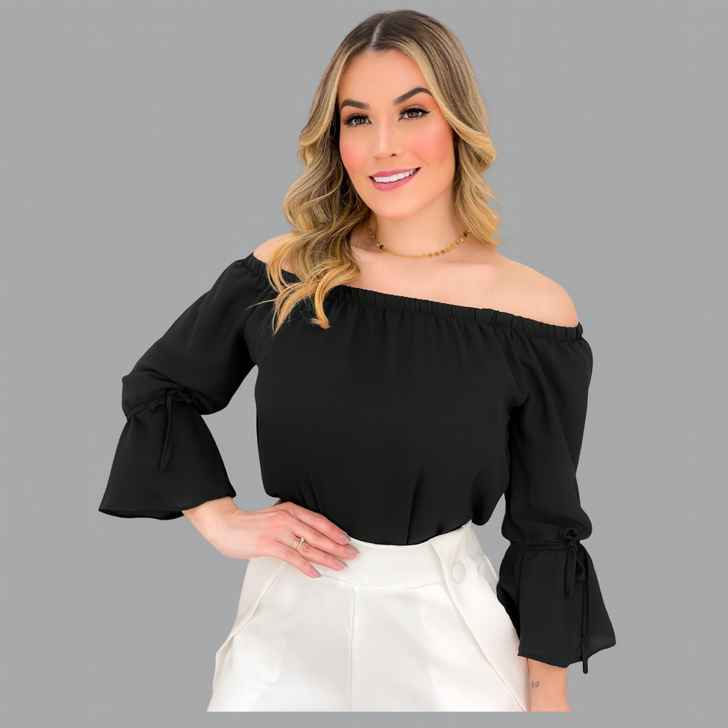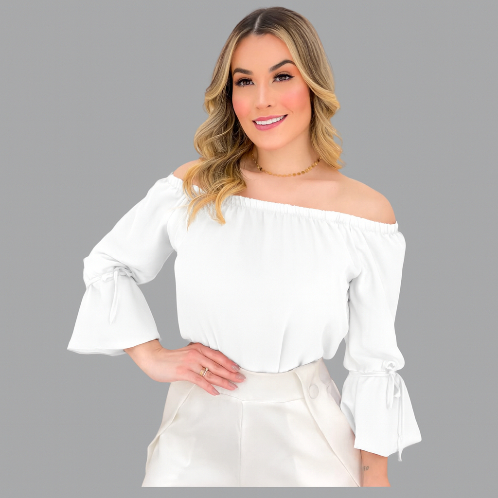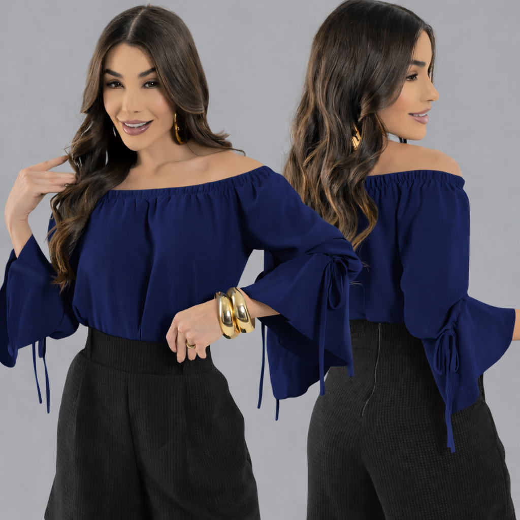 Blusa Feminina Ombro a Ombro Manga 3/4 com Amarração – Elegante e Moderna Verão 2025
