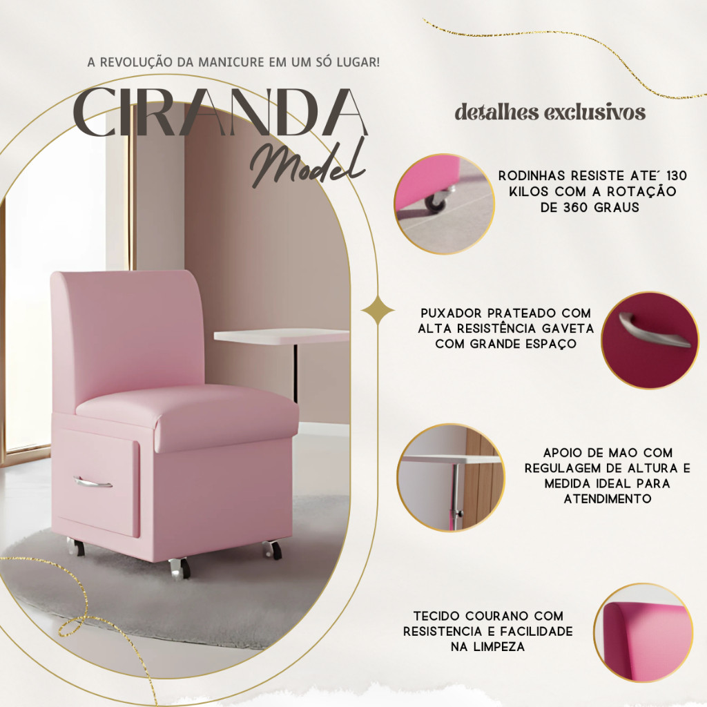 Cadeira Ciranda Rosa bebe Manicure Carrinho Gaveta Móvel Salão Apoio de Mão Esmalte Rodinha