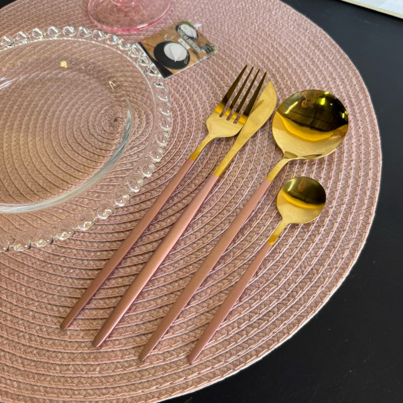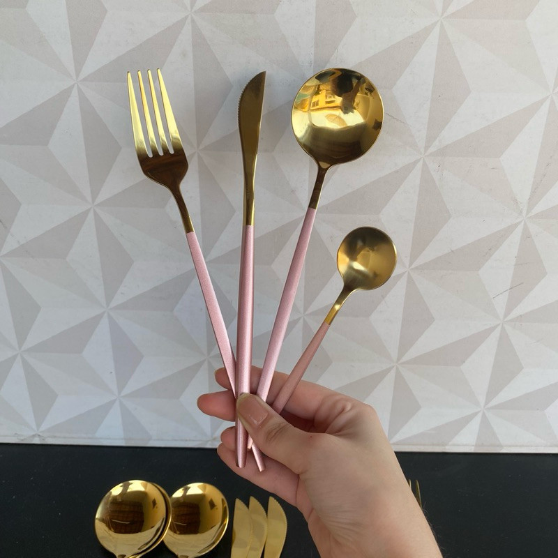 Conjunto de talheres rosa com dourado de inox com 24 peças - ZemMart
