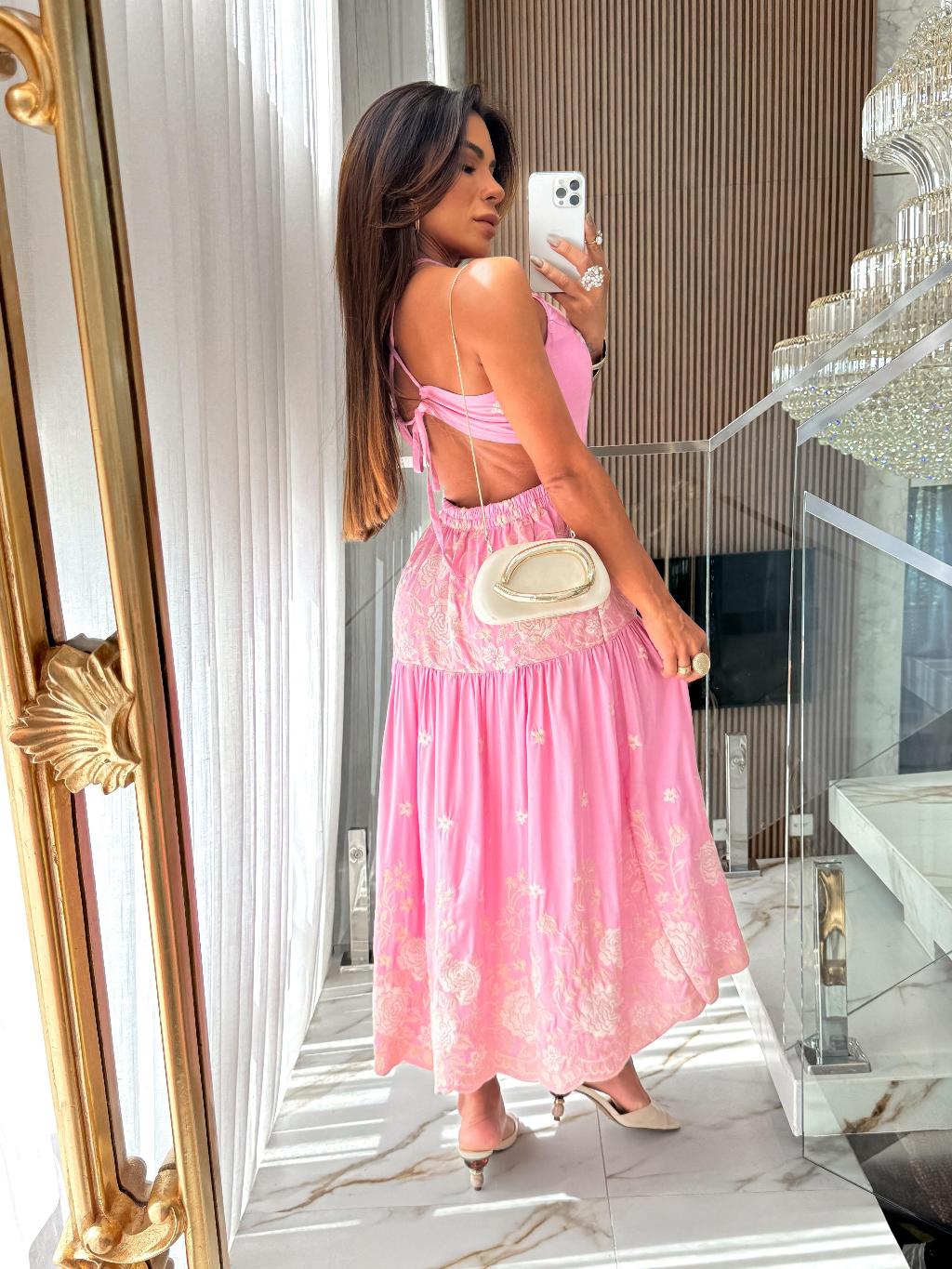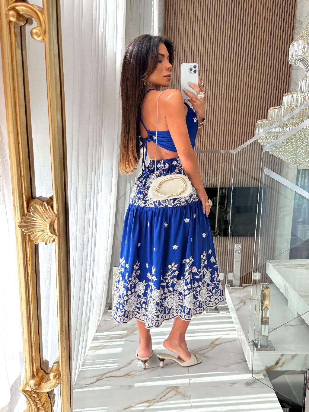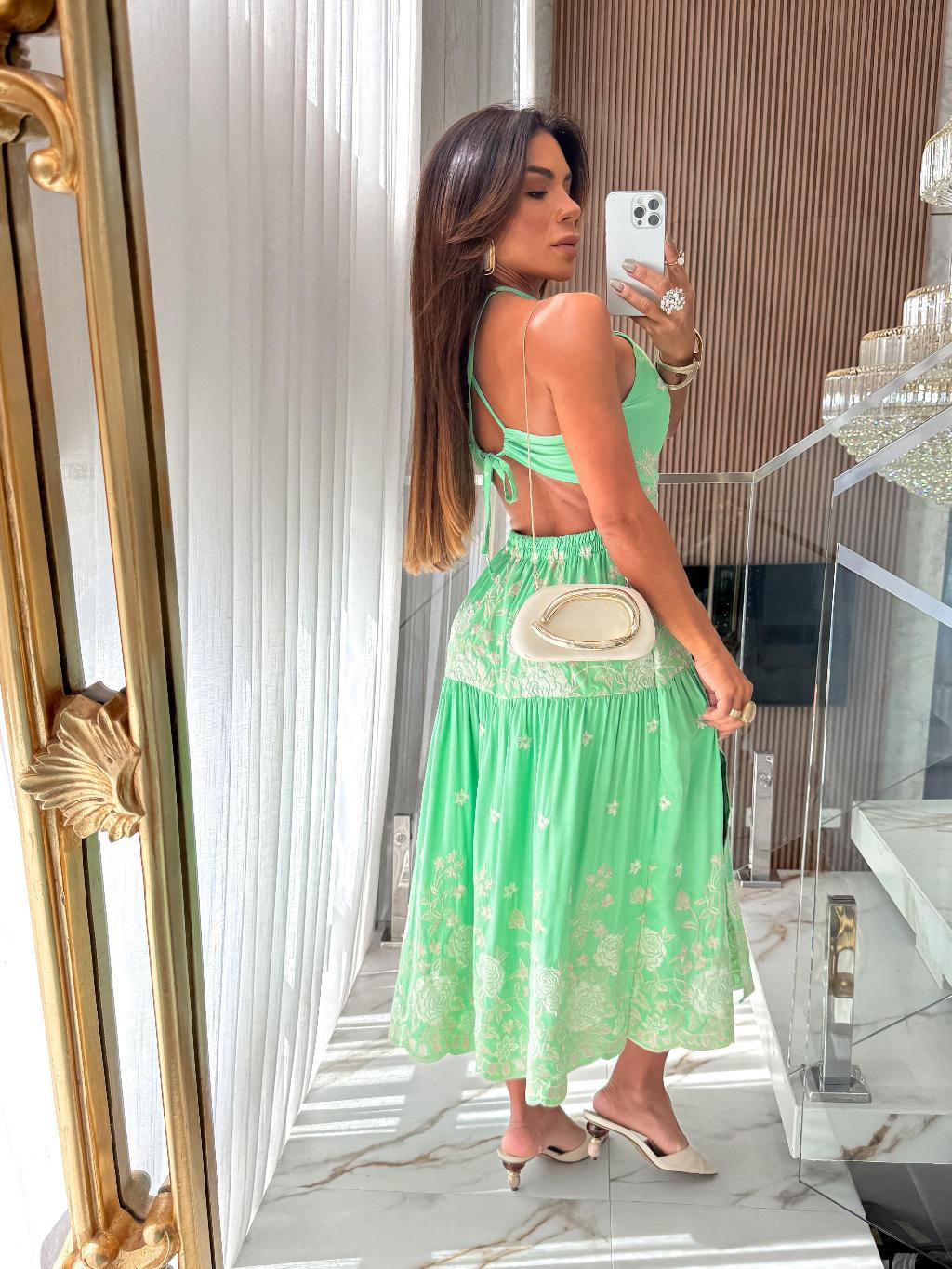Vestido Feminino Midi Lese Bordado Gola Alta Amarração nas Costas Moda Casual Luxo