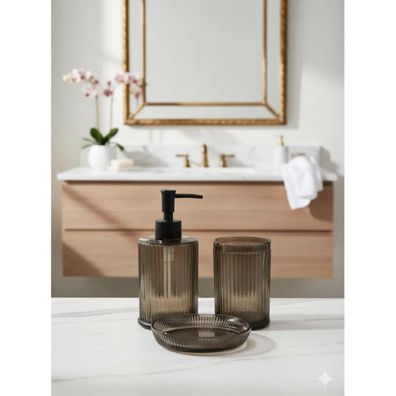 Kit Banheiro Lavabo Mystic 3 peças Vidro Canelado Marrom Detalhes Preto Dispenser Pote Saboneteira