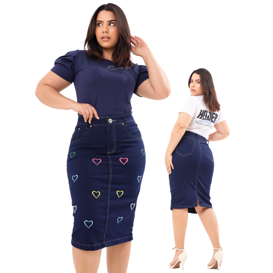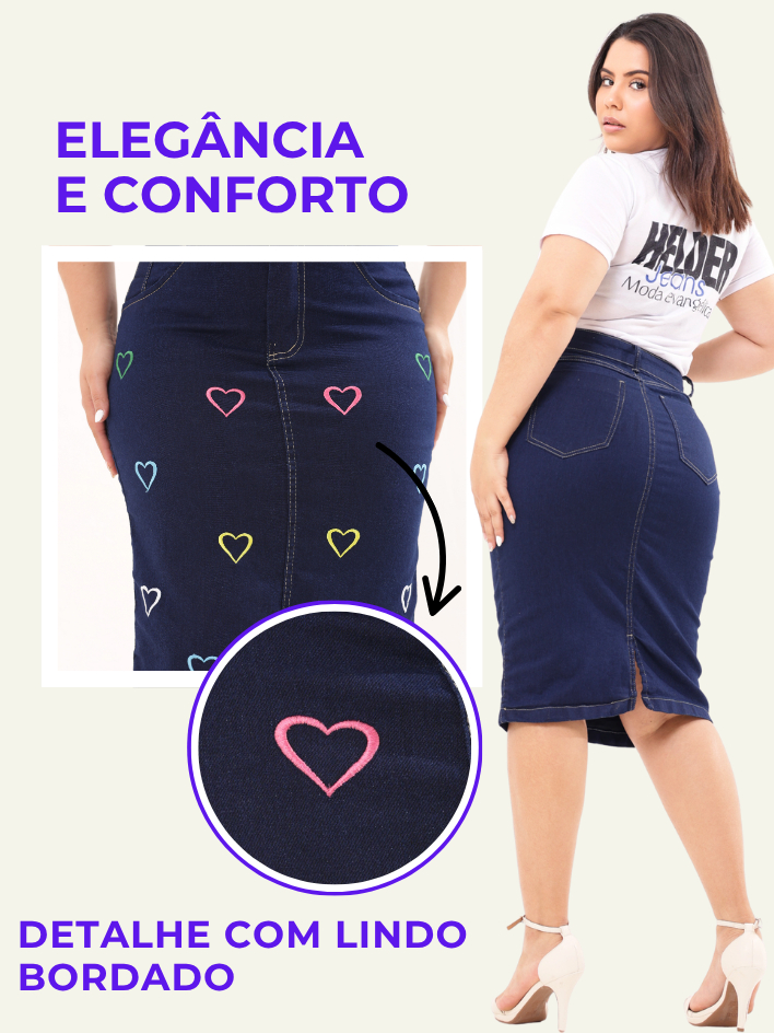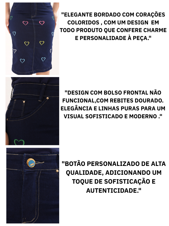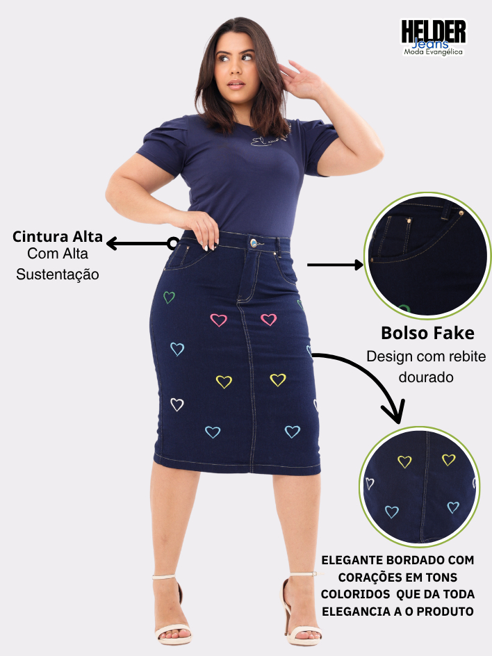 Saia Jeans Midi Evangelica Premium Com Bordado Com Corações Coloridos Cintura Alta com Lycra Azul Marinho