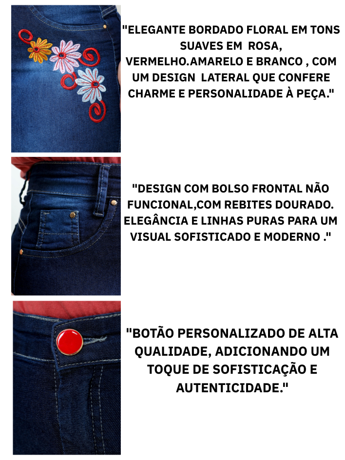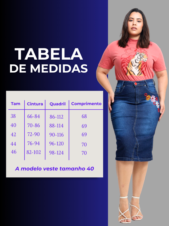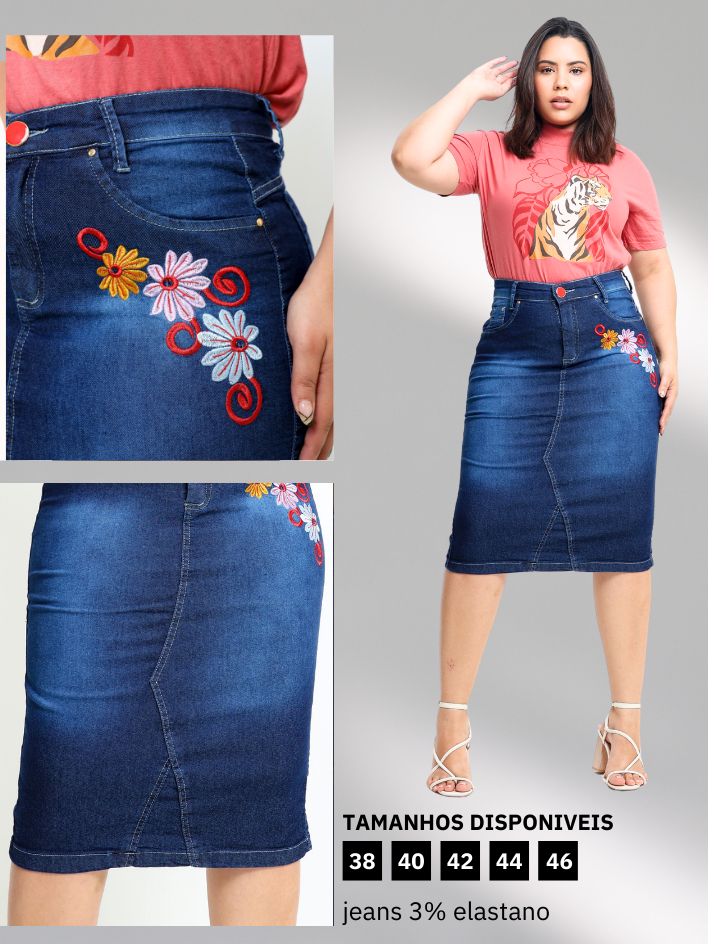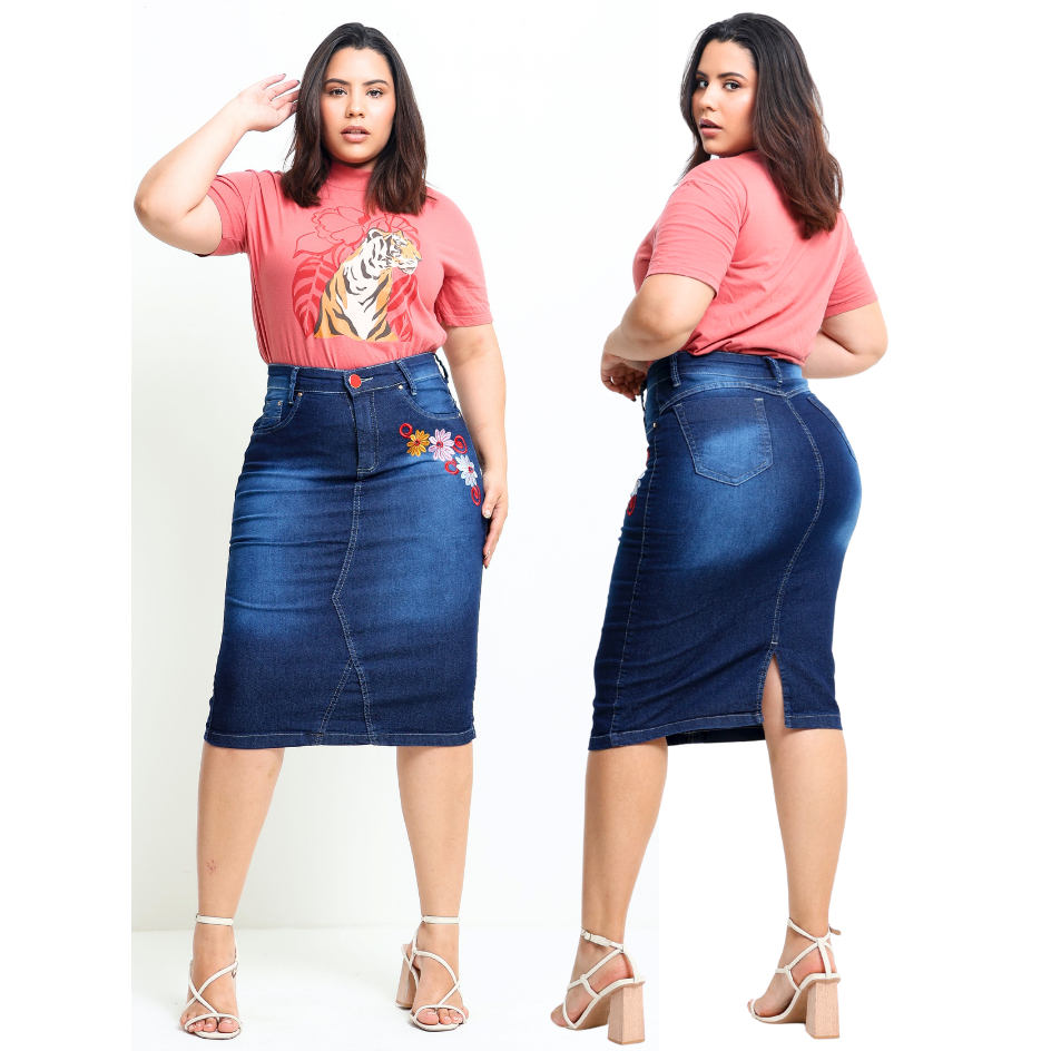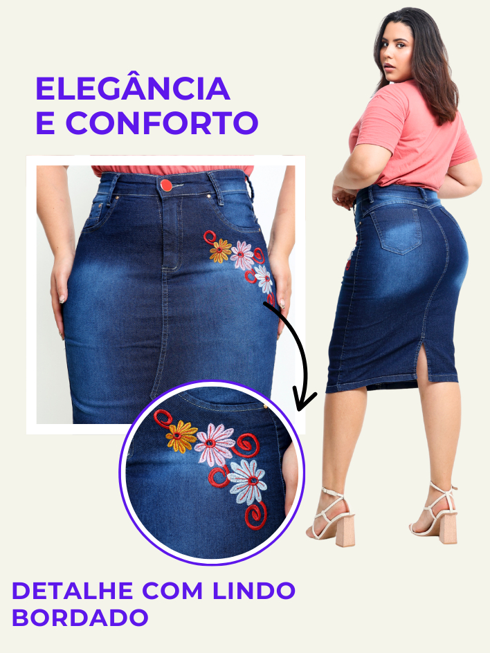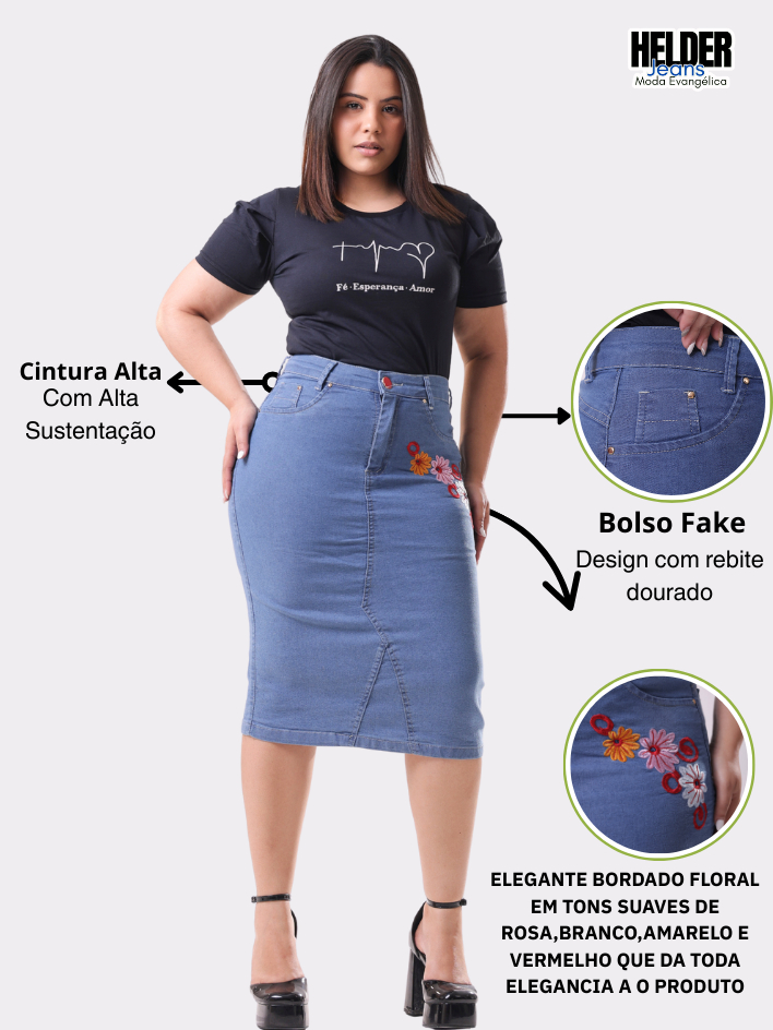 Saia Jeans Midi Evangelica Bordada Cintura Alta com Lycra