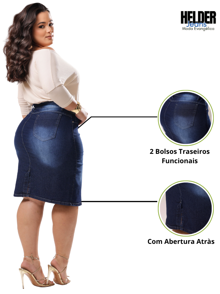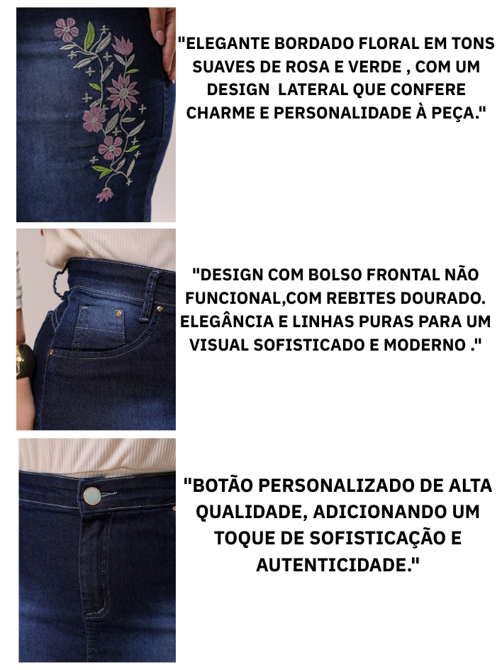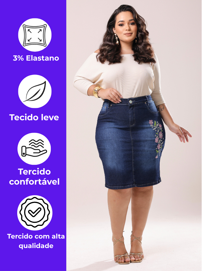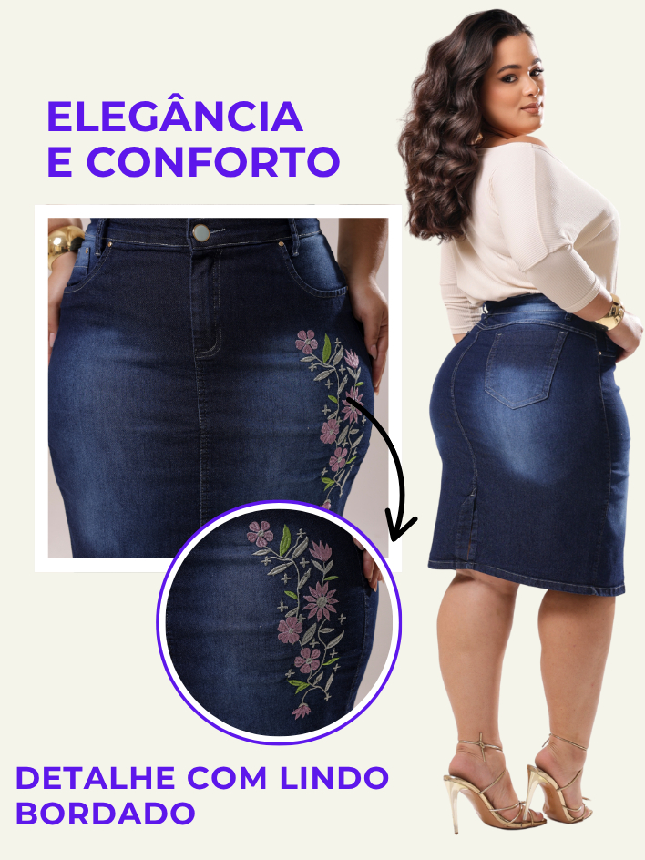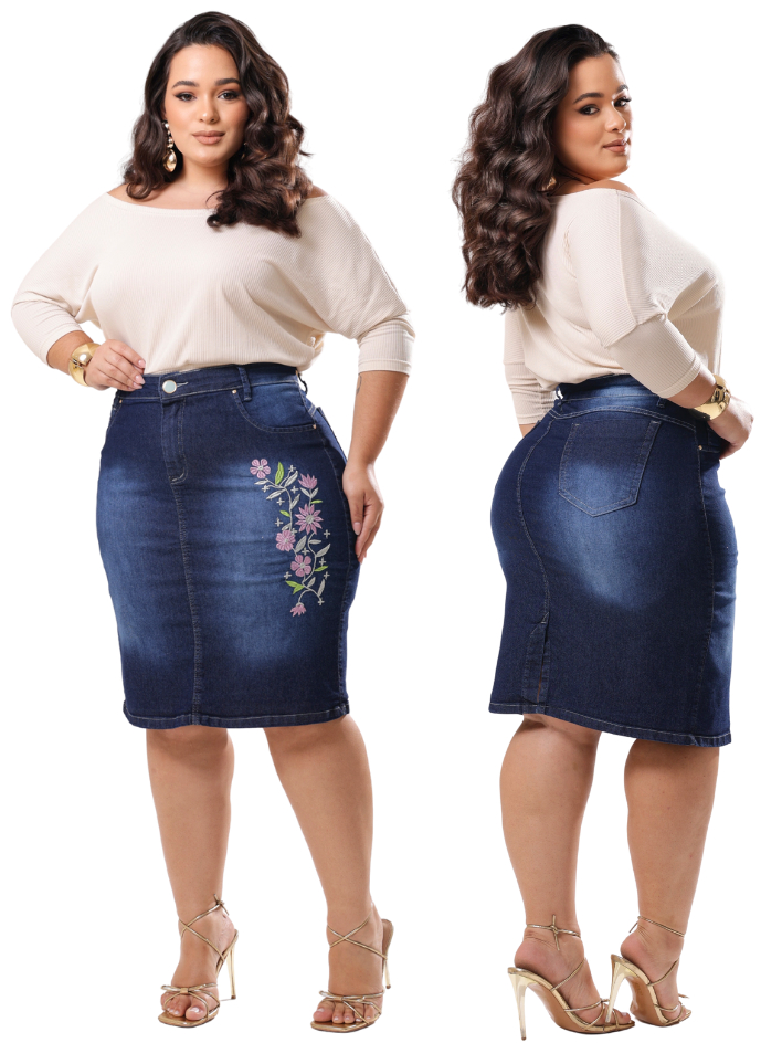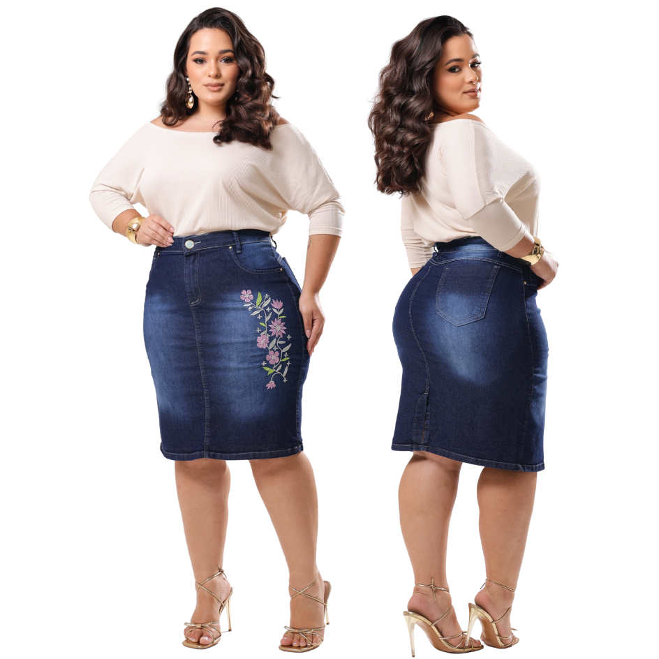 Saia Plus Size Evangelica do 46 ao 54 Jeans Com Laycra e Bordado Com Flores Em Tons Em Rosa E Verde