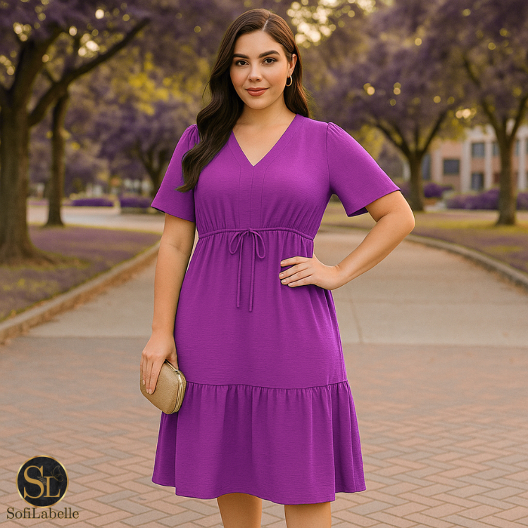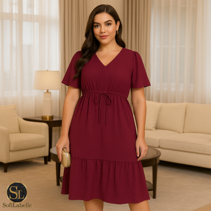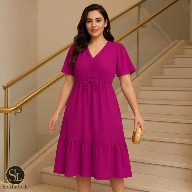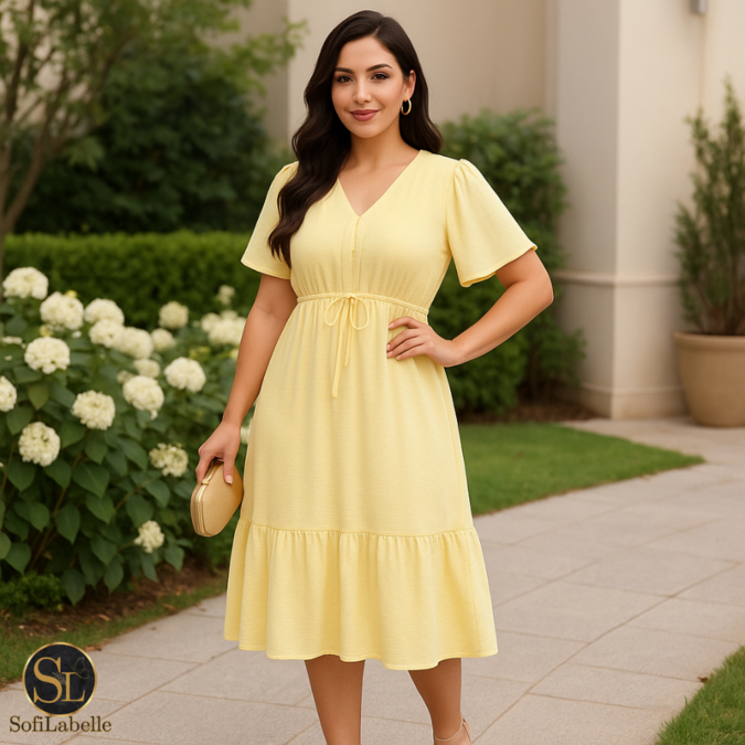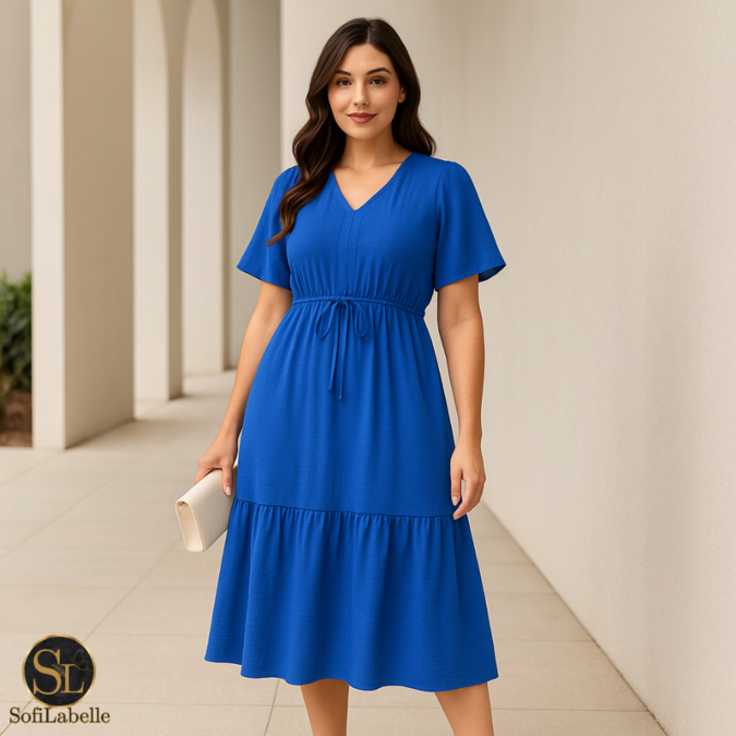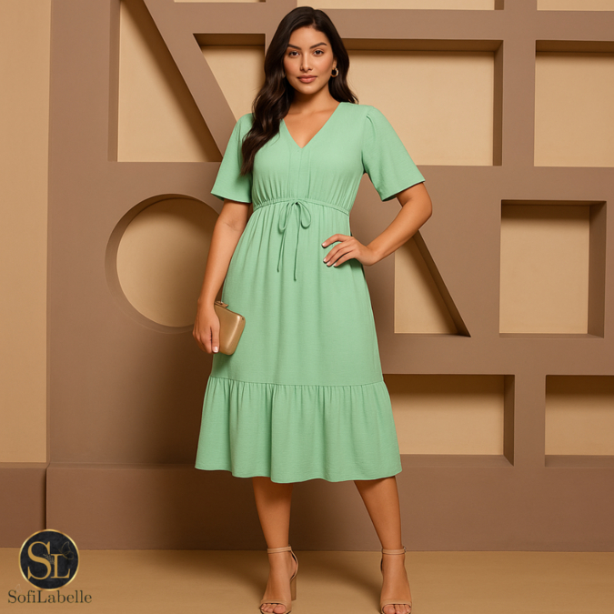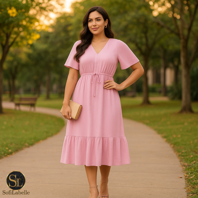 Vestido Midi Feminino Manga Curta Babado Cintura Ajustável Elegante Casual Festa Trabalho Verão 2026