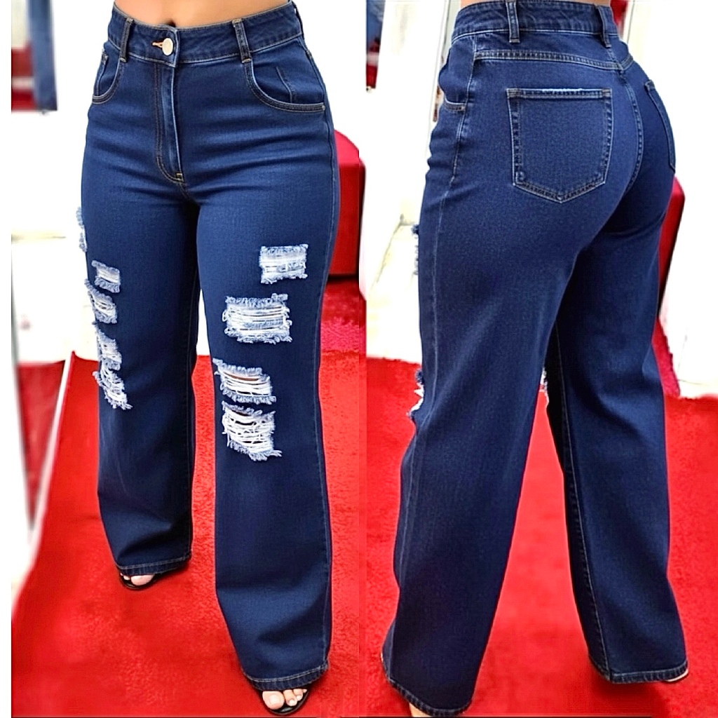 Calça WideLeg Jeans Feminina Denim Destroyed Linha Premium Modela Bumbum Pantalona Larguinha