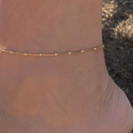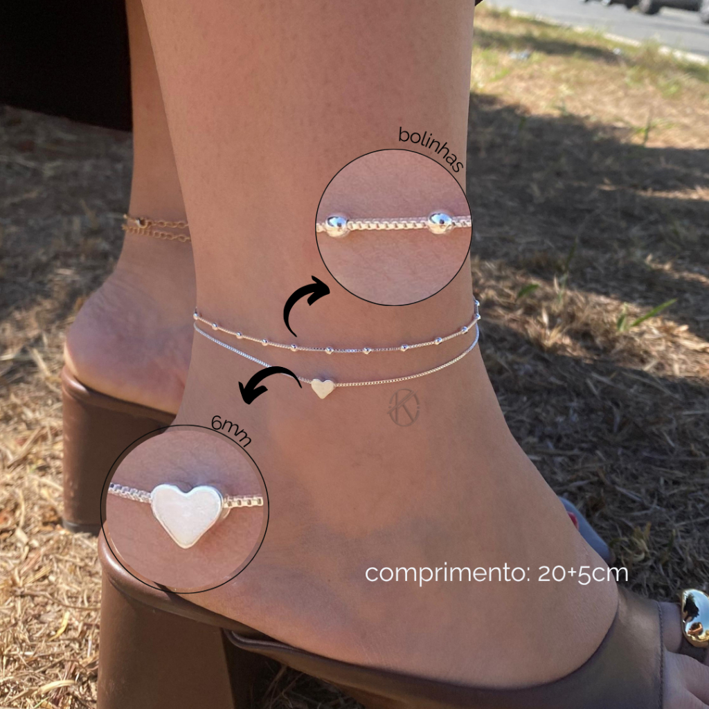 KIT 02 TORNOZELEIRAS FEMININAS CORRENTES DE CORAÇÃO E DE BOLINHA - BANHADAS EM PRATA 925 OU OURO 18k