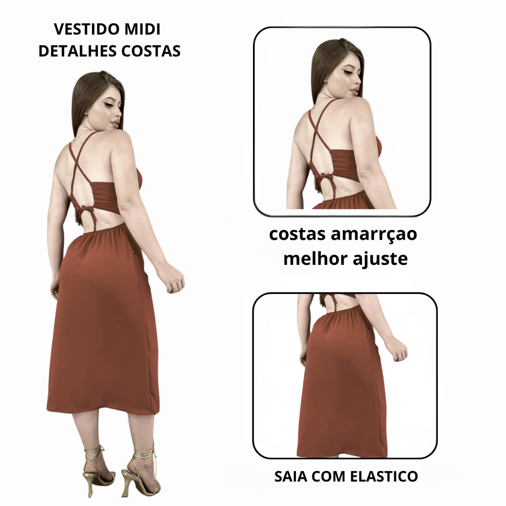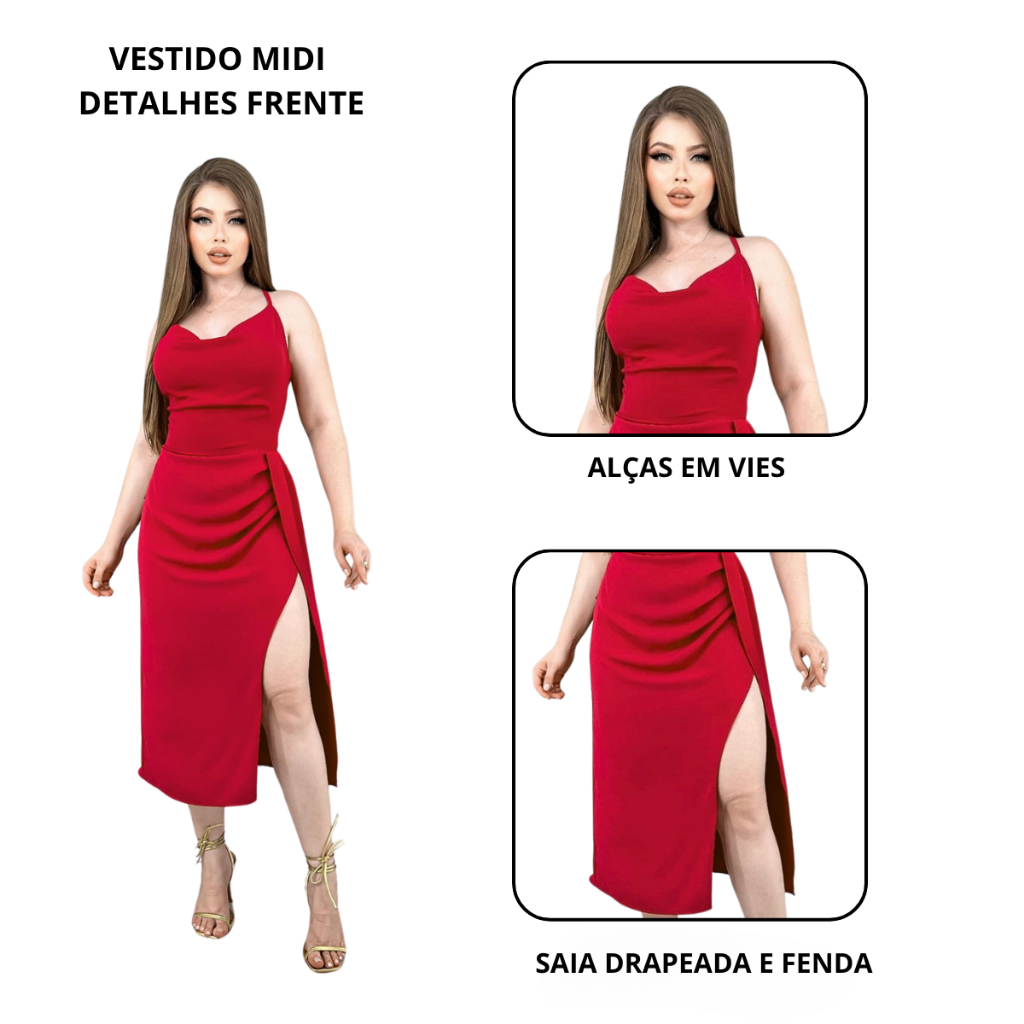 Vestido Midi Curto Feminino Fenda Alça Fina Festa Sensual Elegante