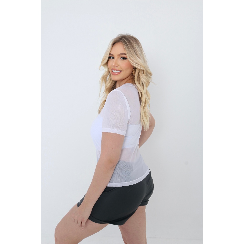 Blusa Tule Manga Curta Gola Redonda Camiseta Feminina Transparente Lisa e Estampada