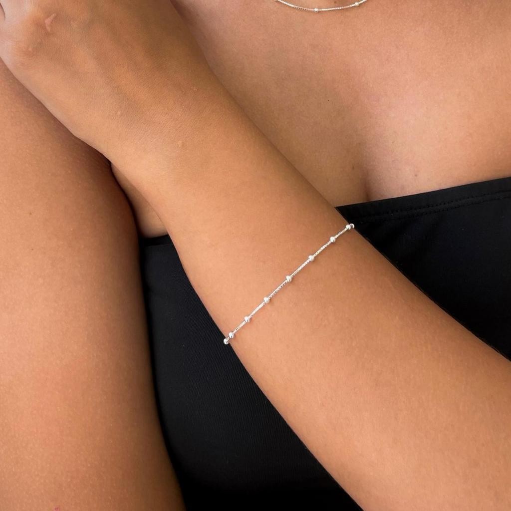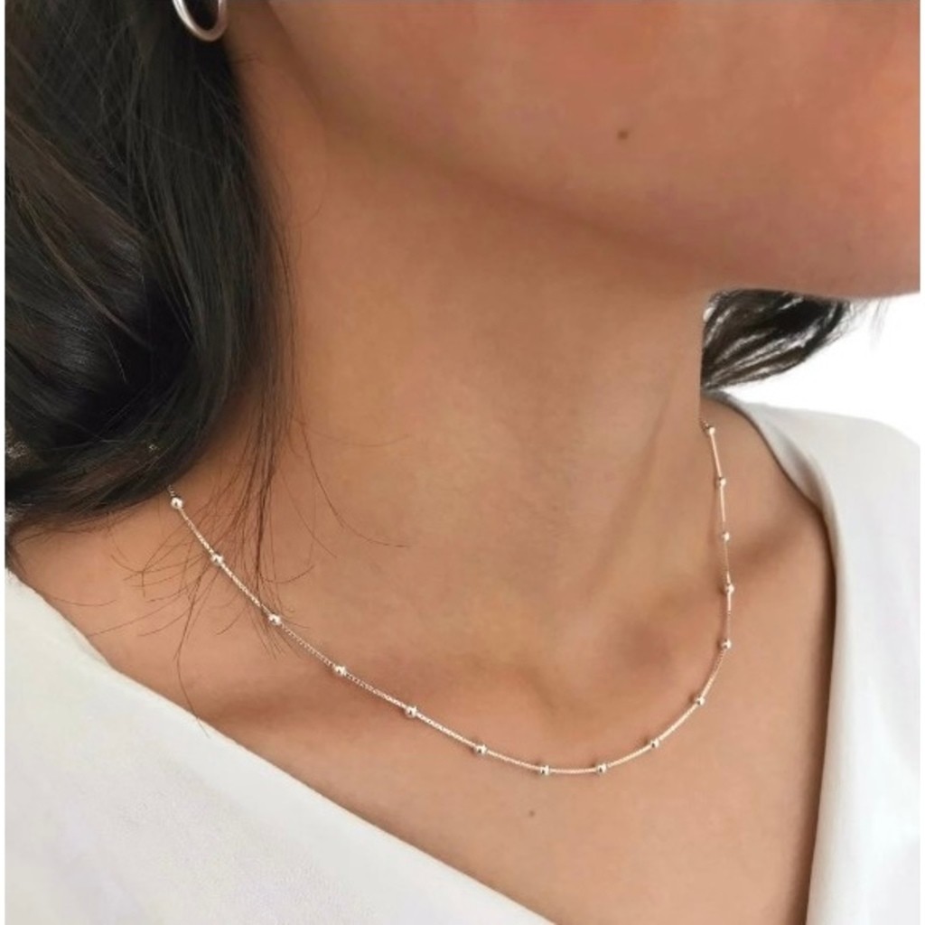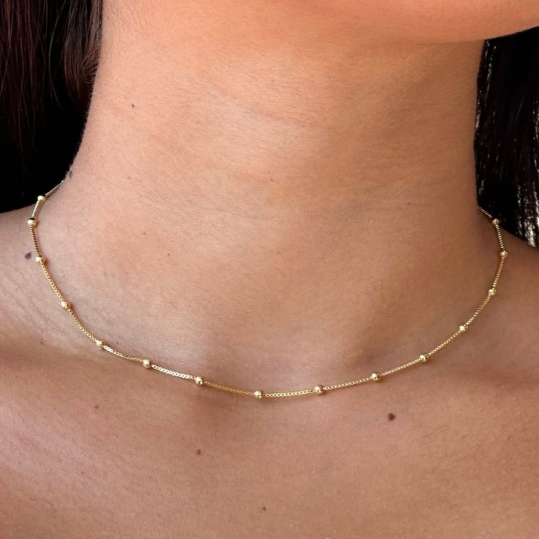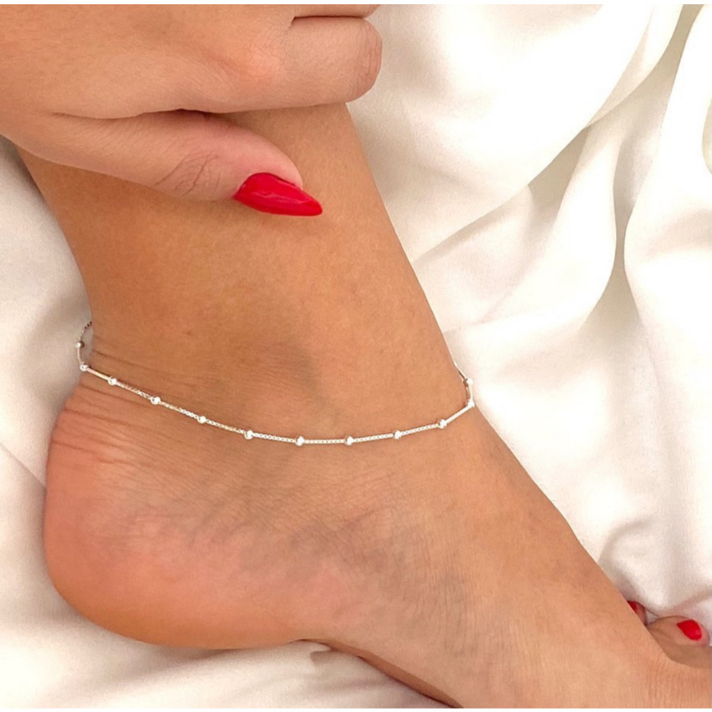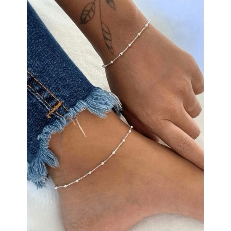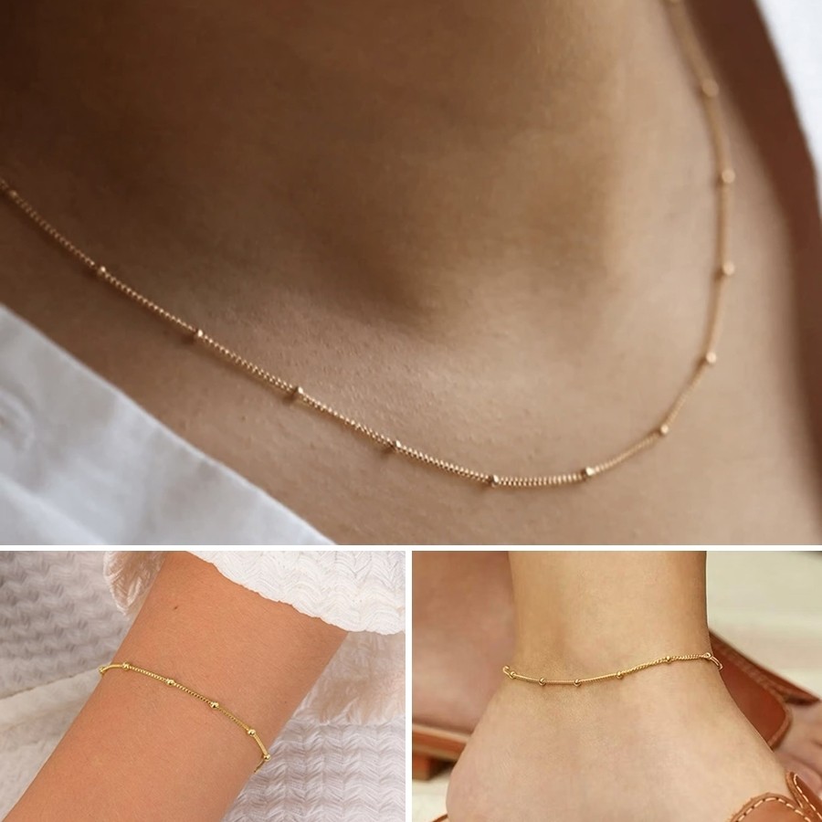 Kit 3 Colar simples feminino pulseira de contas e tornozeleira banhado a ouro 18k prata 925