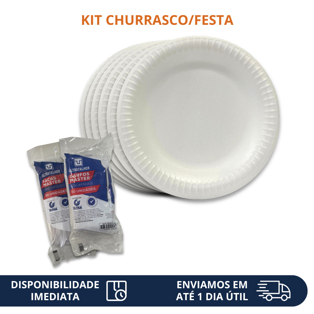 Kit Churrasco/Festa Descartável 100x Prato de Isopor + 100x Garfo + 100x Faca Transparente Forte