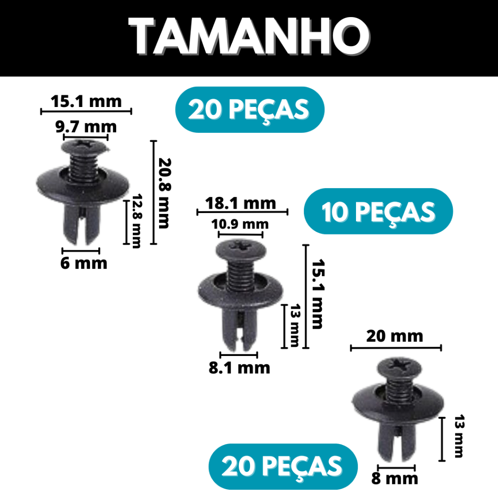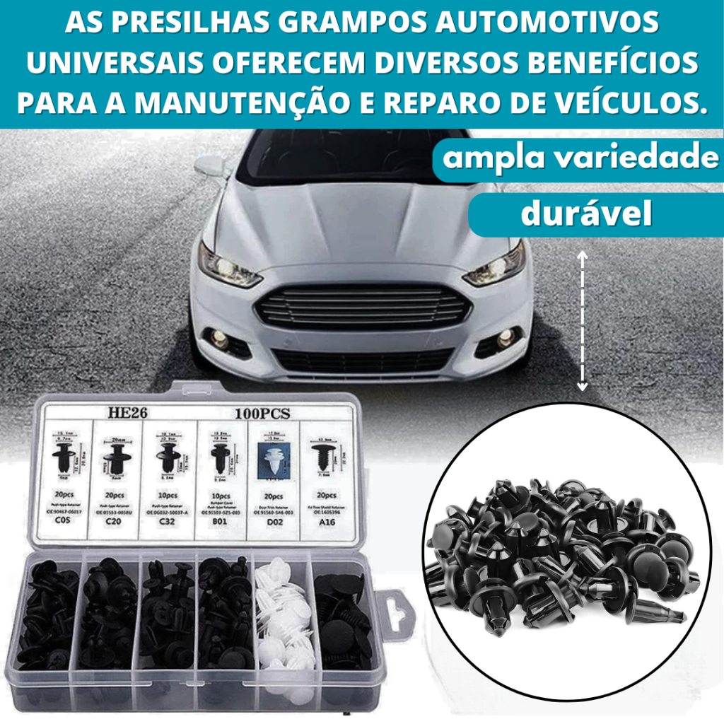 Kit 100 Grampo Presilha Automotiva Prendedor Hibrido De Clipes De Fixação De Peças Pino Parachoque Carro Universal