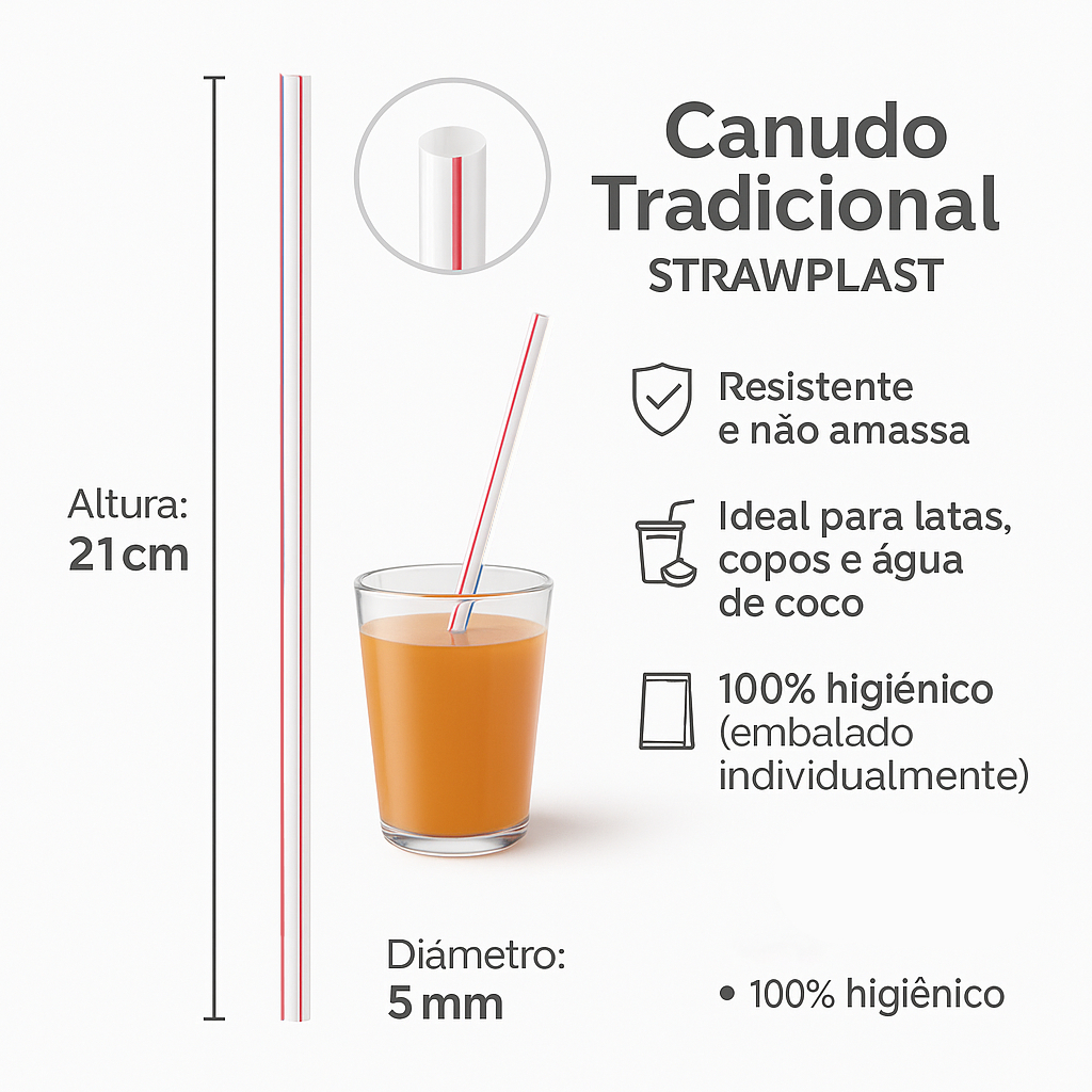 Canudo tradicional plástico 1500 unidades sucos refrescos refrigerante 21 cm branco e vermelho