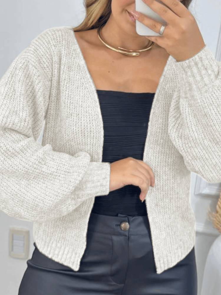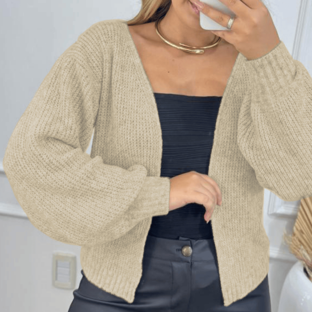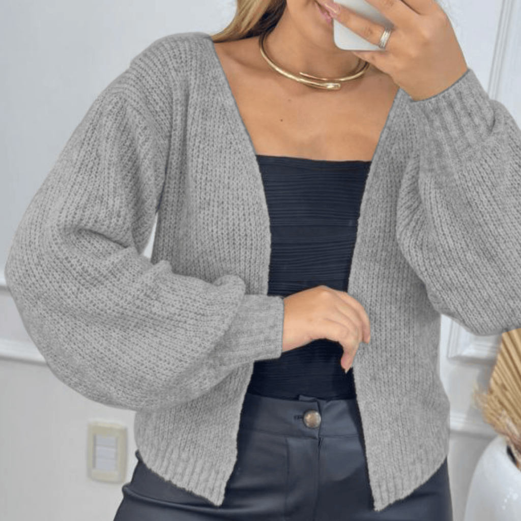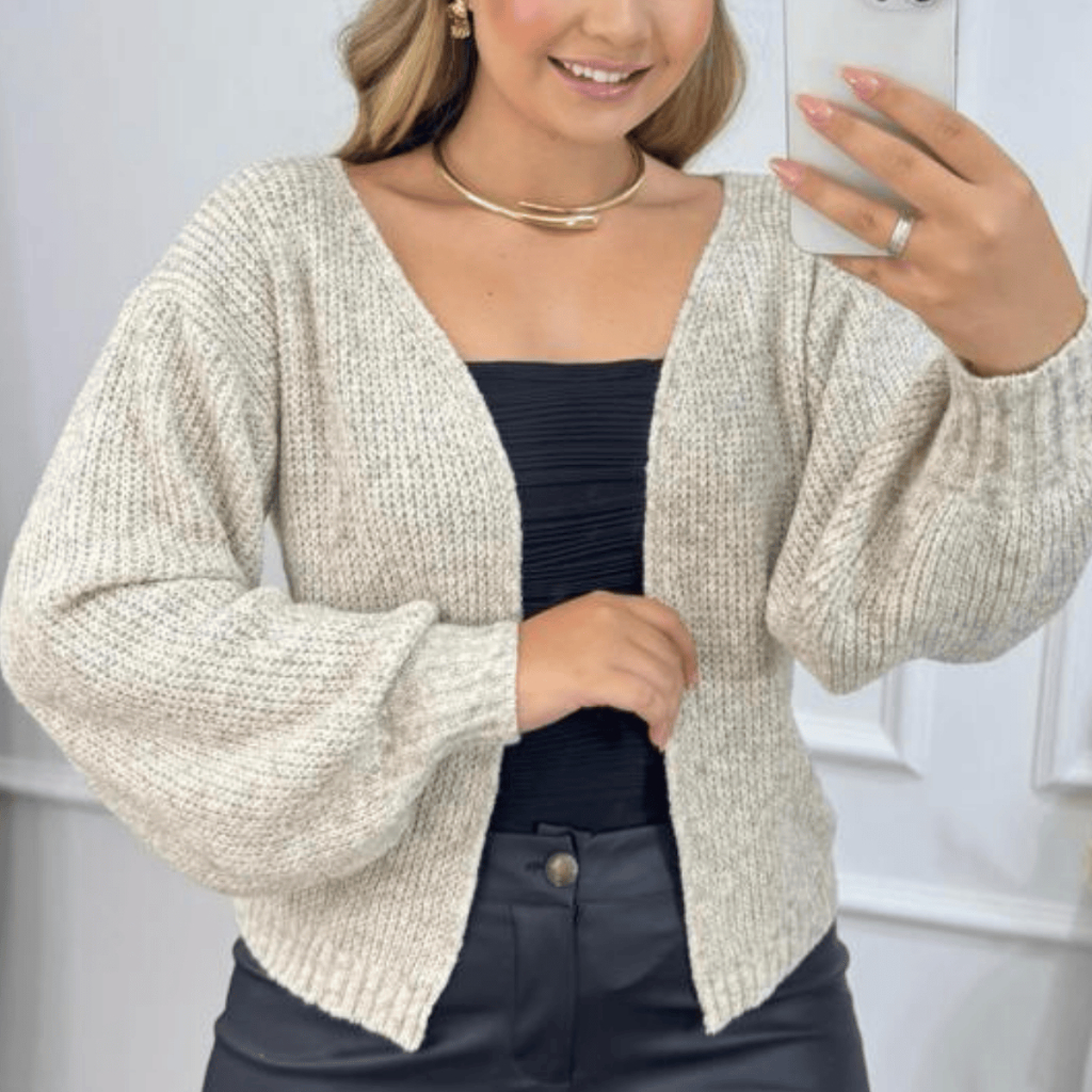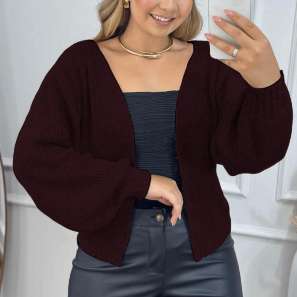Casaco Curto Feminino Tricot Mousse Premium Casqueto de Lã Moda Inverno Elegante Manga Bufante