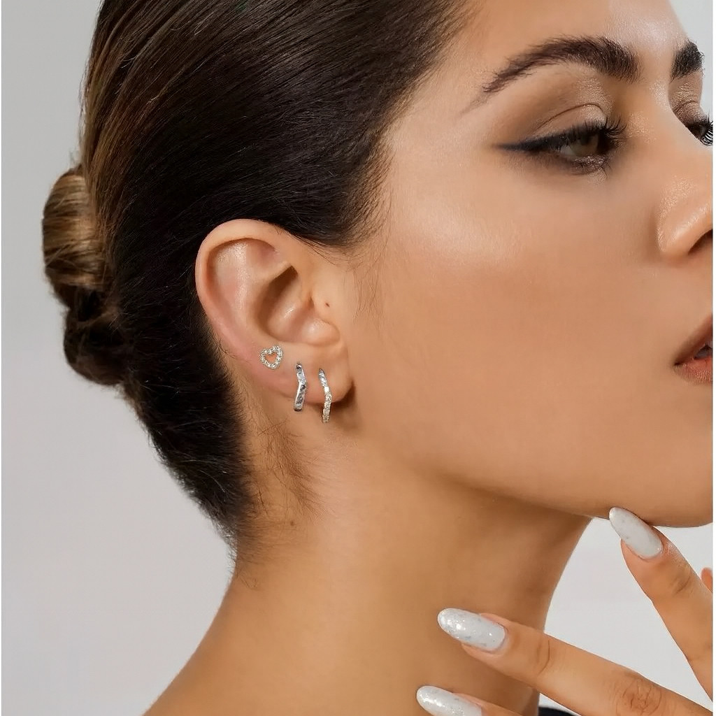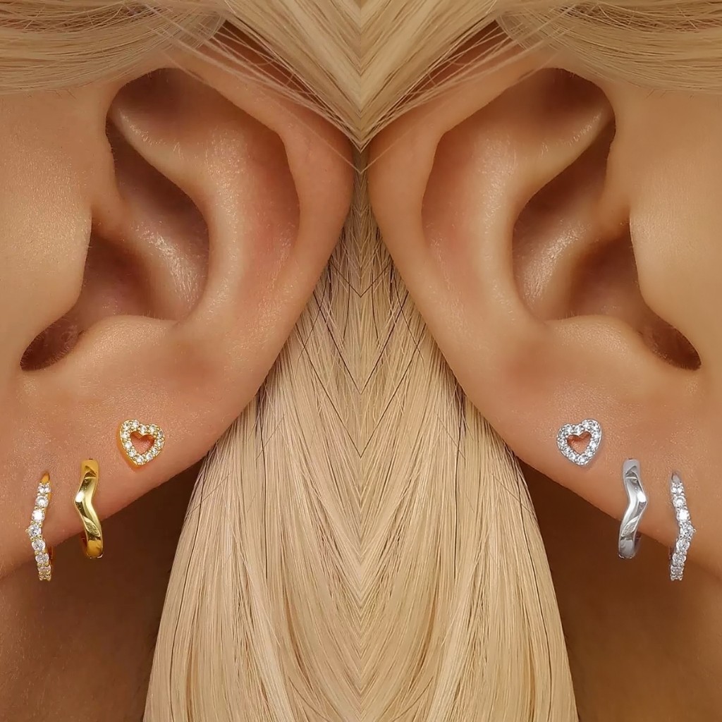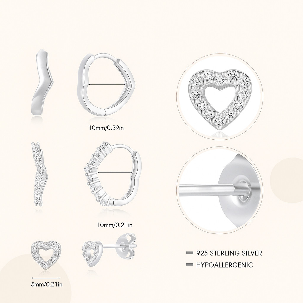 Kit 3 pares de brincos de luxo em prata 925 para mulheres, brincos de pino em forma de coração, banhados a ouro 18K