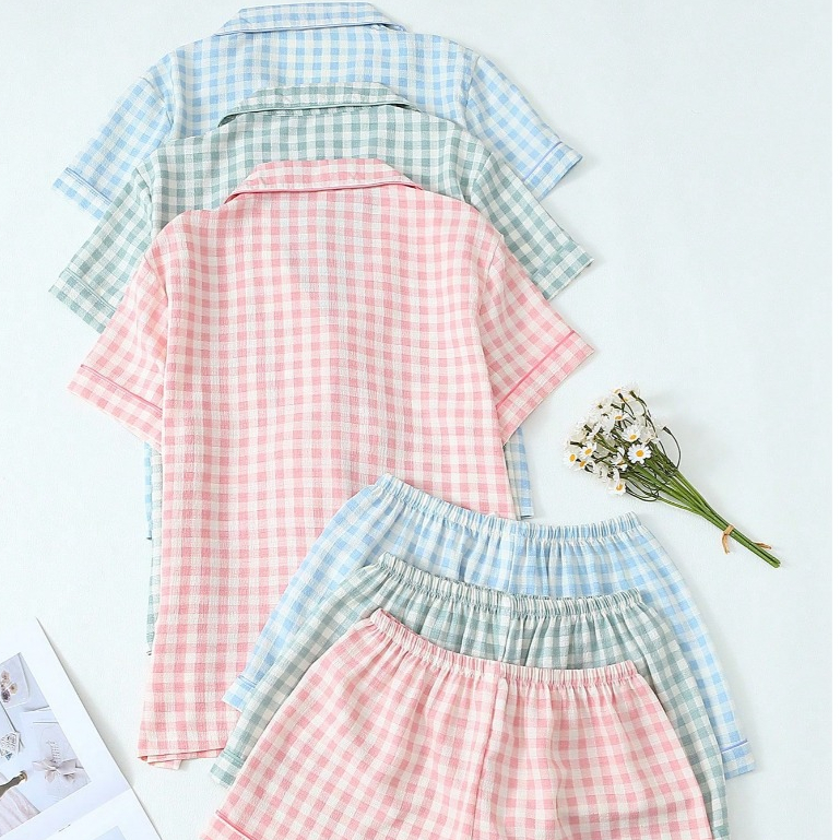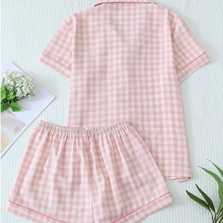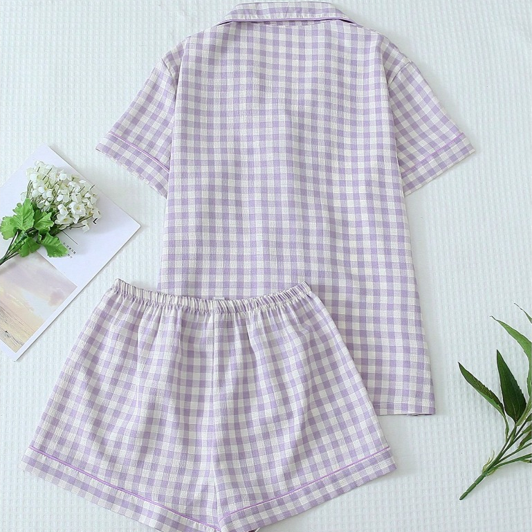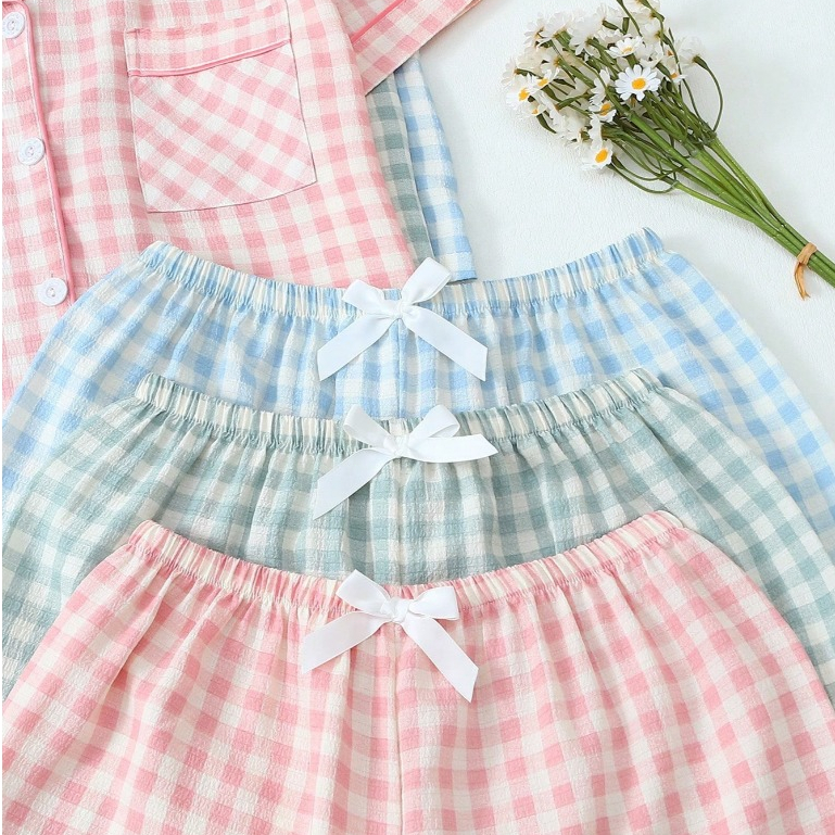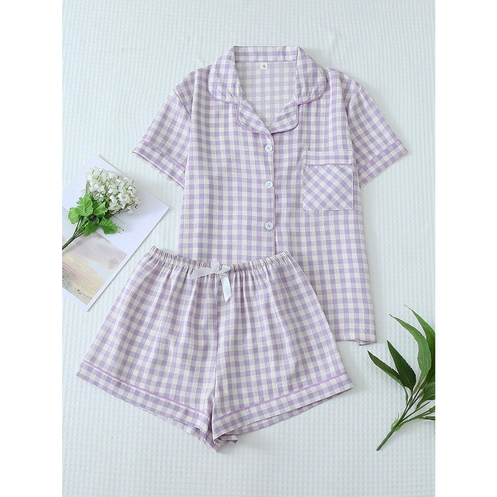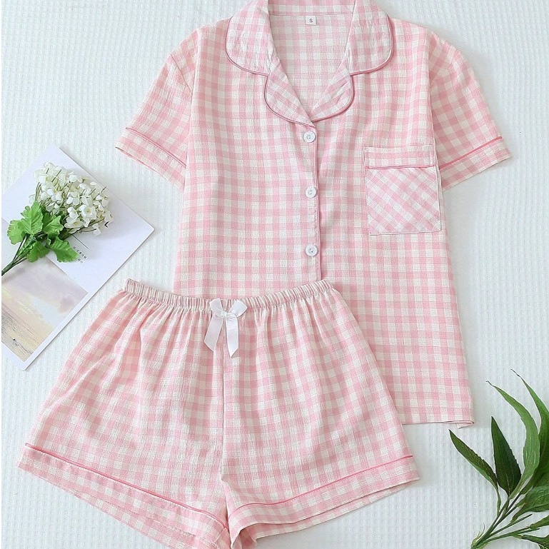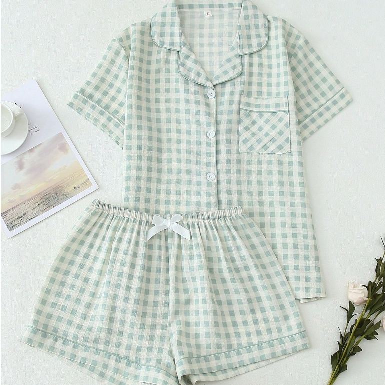 Conjunto de Pijama Feminino Estampa Xadrez 2 Peças Top Manga Curta com Botões e Short com Laço