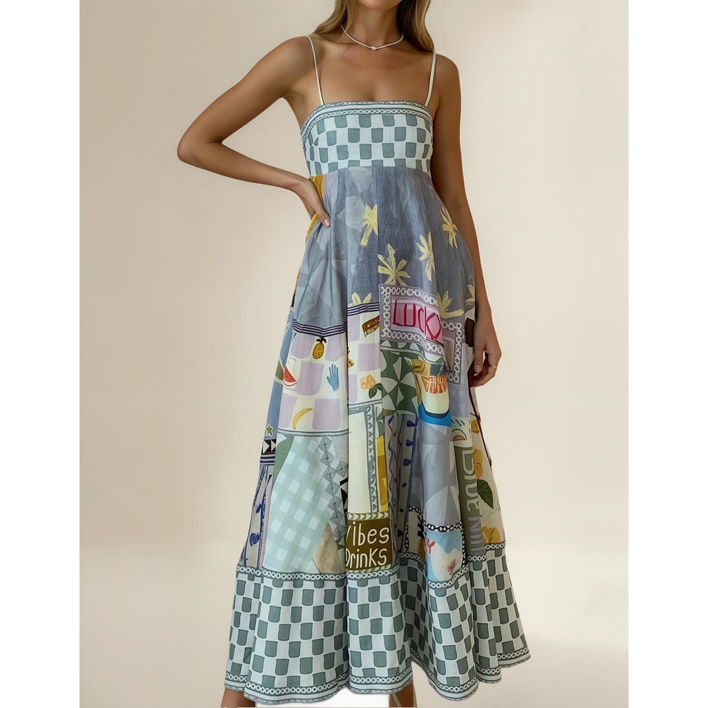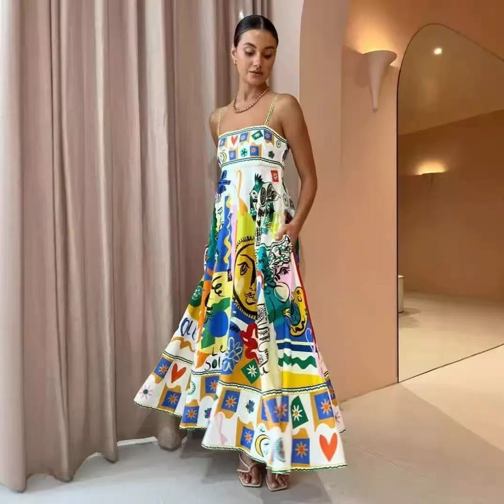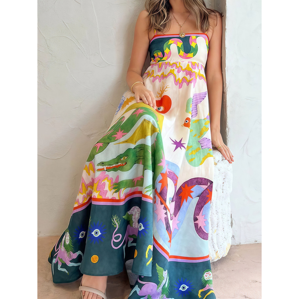 Vestido Para Mulheres Padrão Feminino Boho Longo De Festa Elegante Pop Camisole Estampado Com Costas Abertas - QUALY