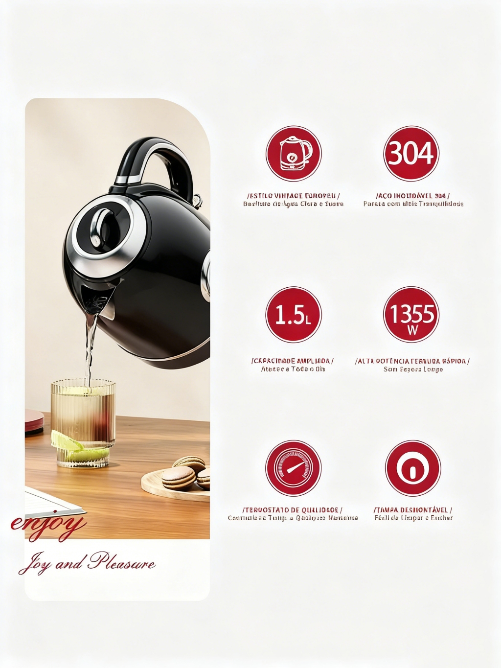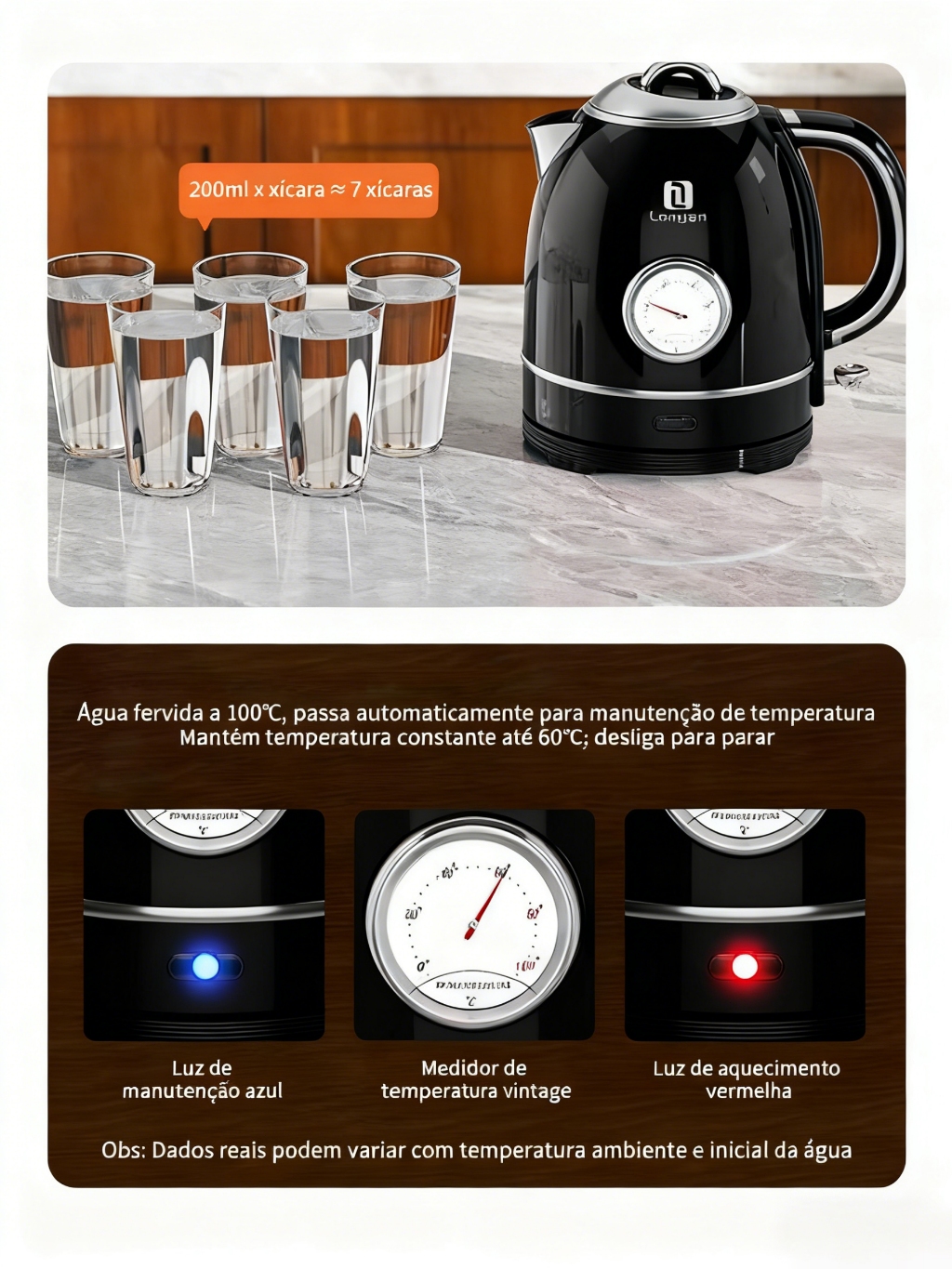 Chaleira Elétrica 1,5L 220V 1355W Aço Inoxidável SUS304 LGR-8015B Desligamento Automático Aquecimento Rápido Para Casa