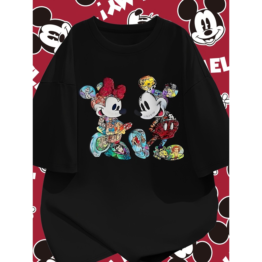 Camiseta Feminina Casual Plus Size De Algodão Com Estampa Divertida Do Mickey E Da Minnie