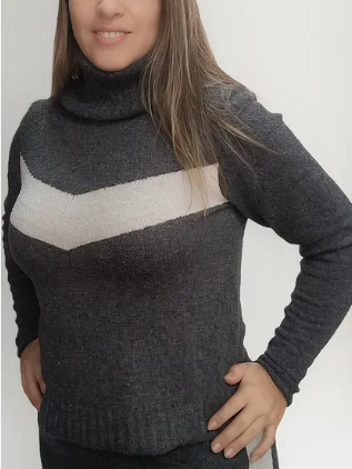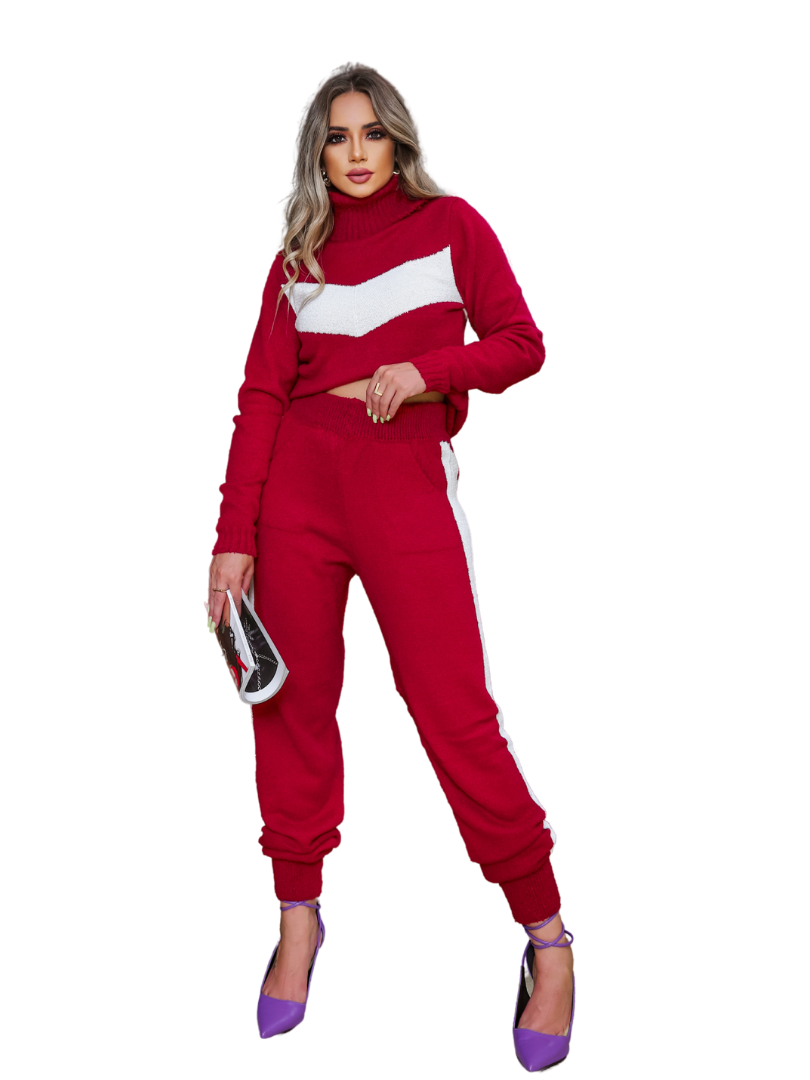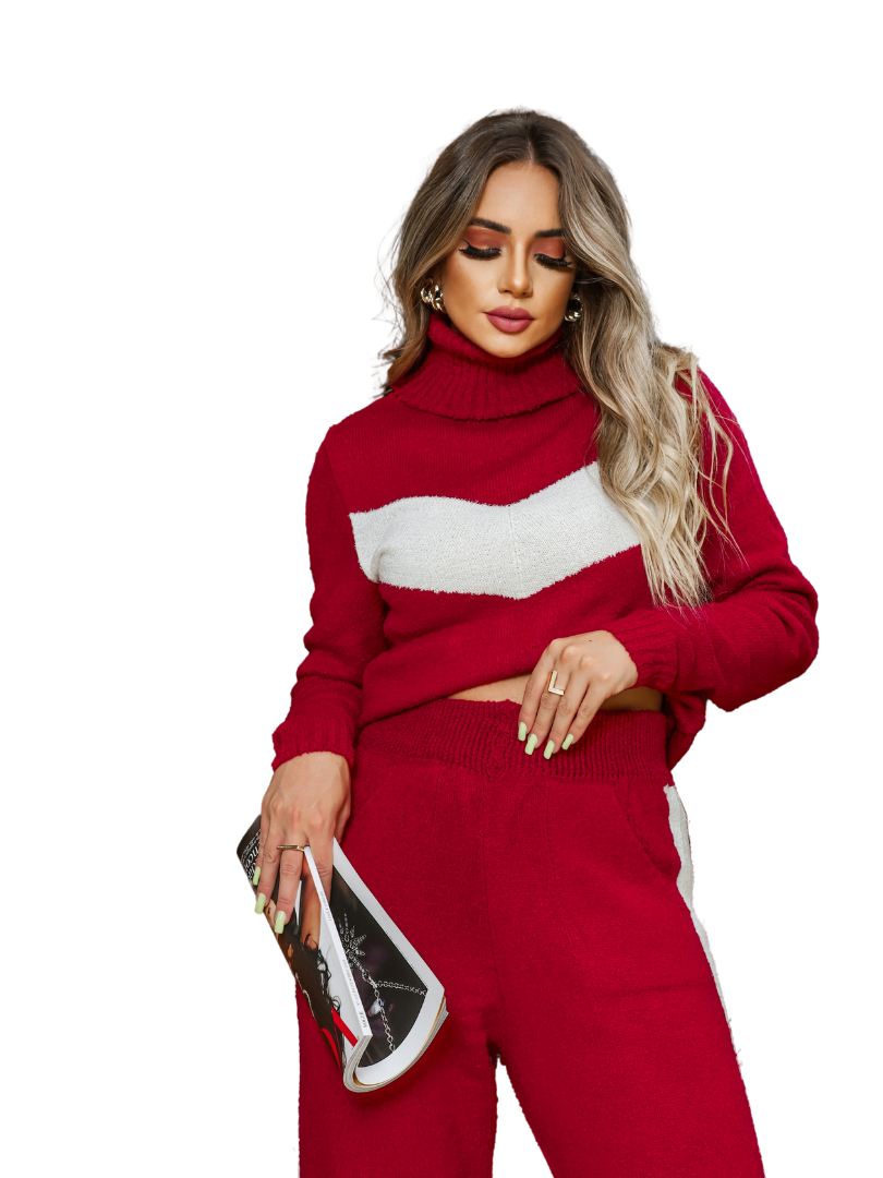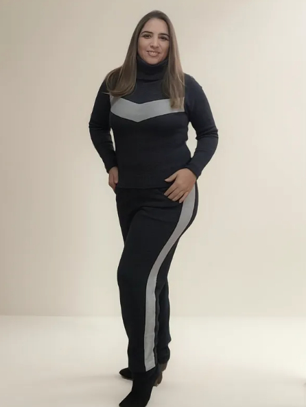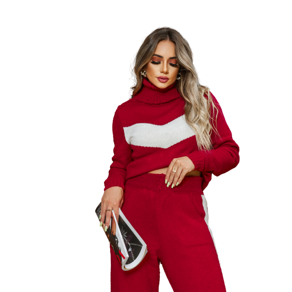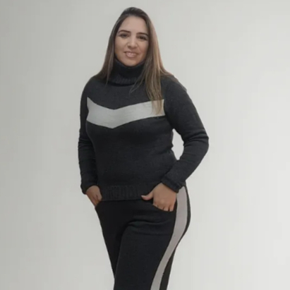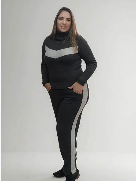 Conjunto feminino blusa e calça frio mousse listra manga longa e gola