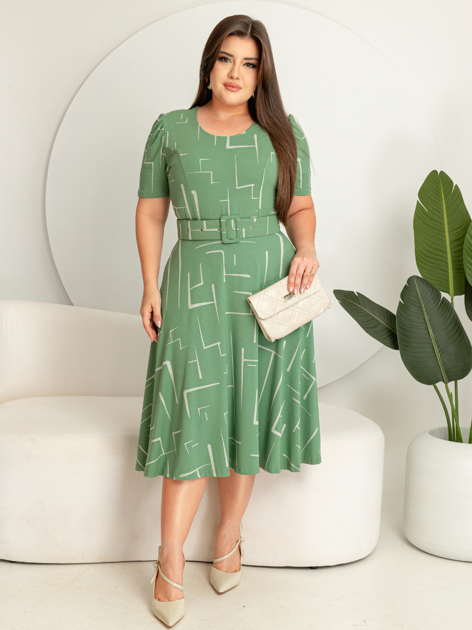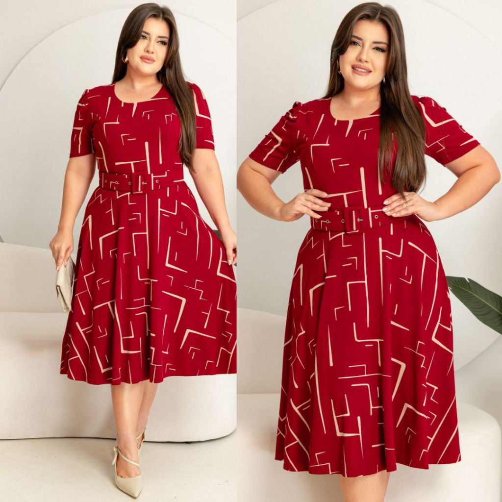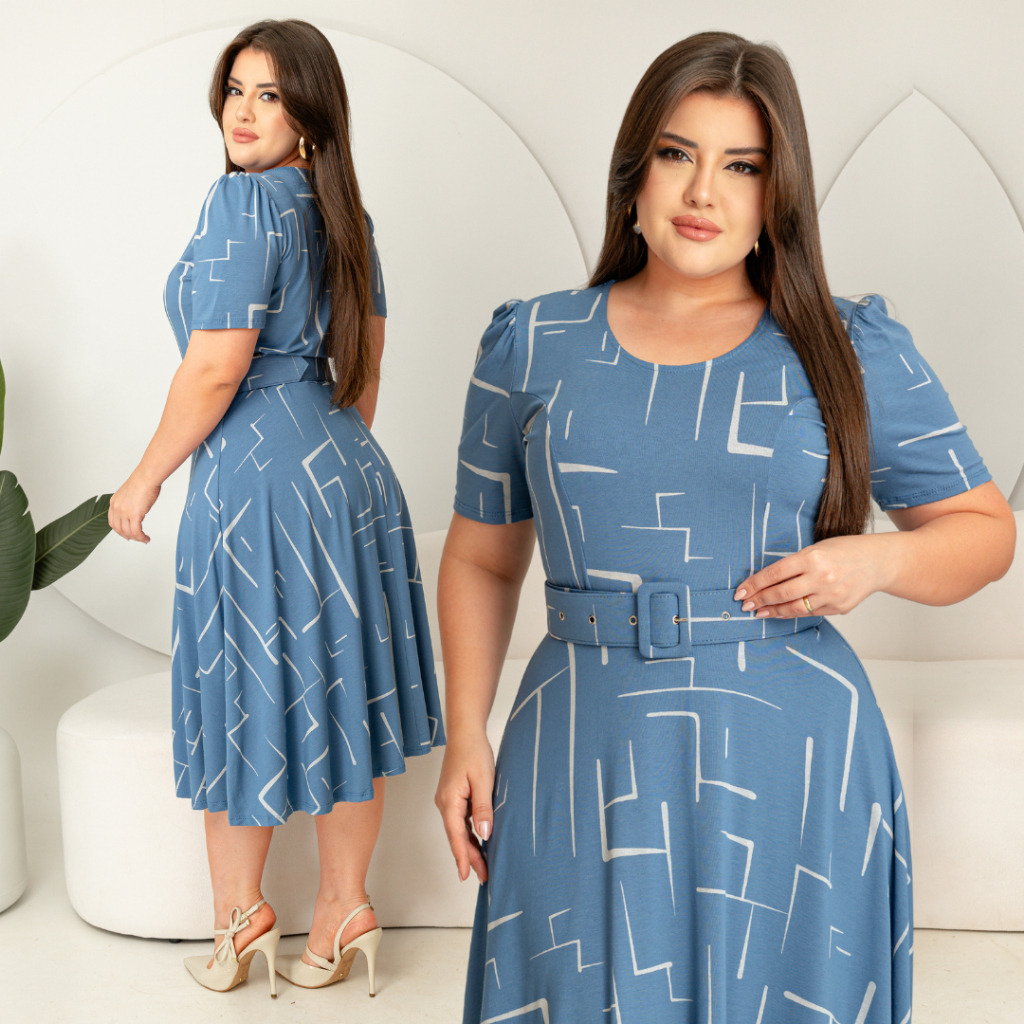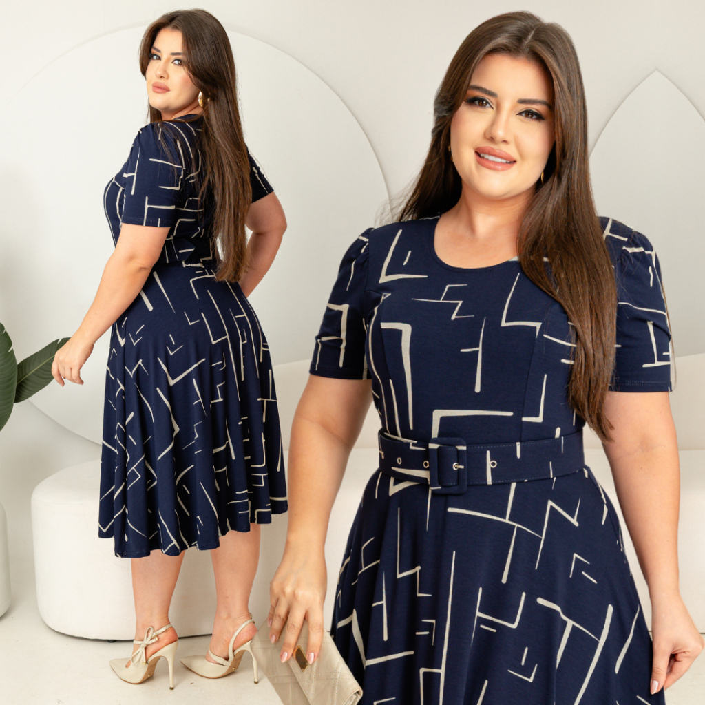Vestido com cinto midi saia rodada godê manga curta decote redondo viscolycra com estampa.
