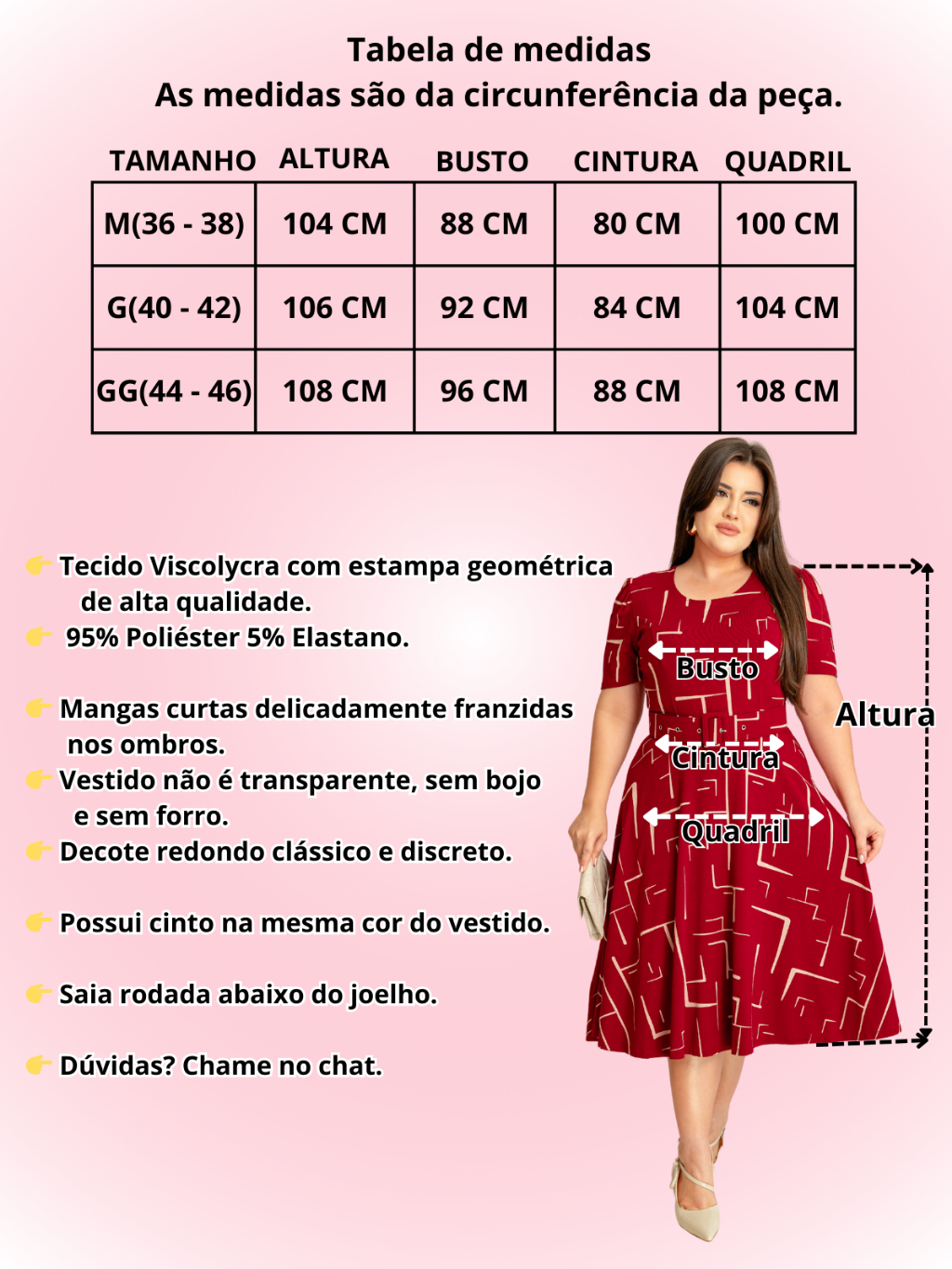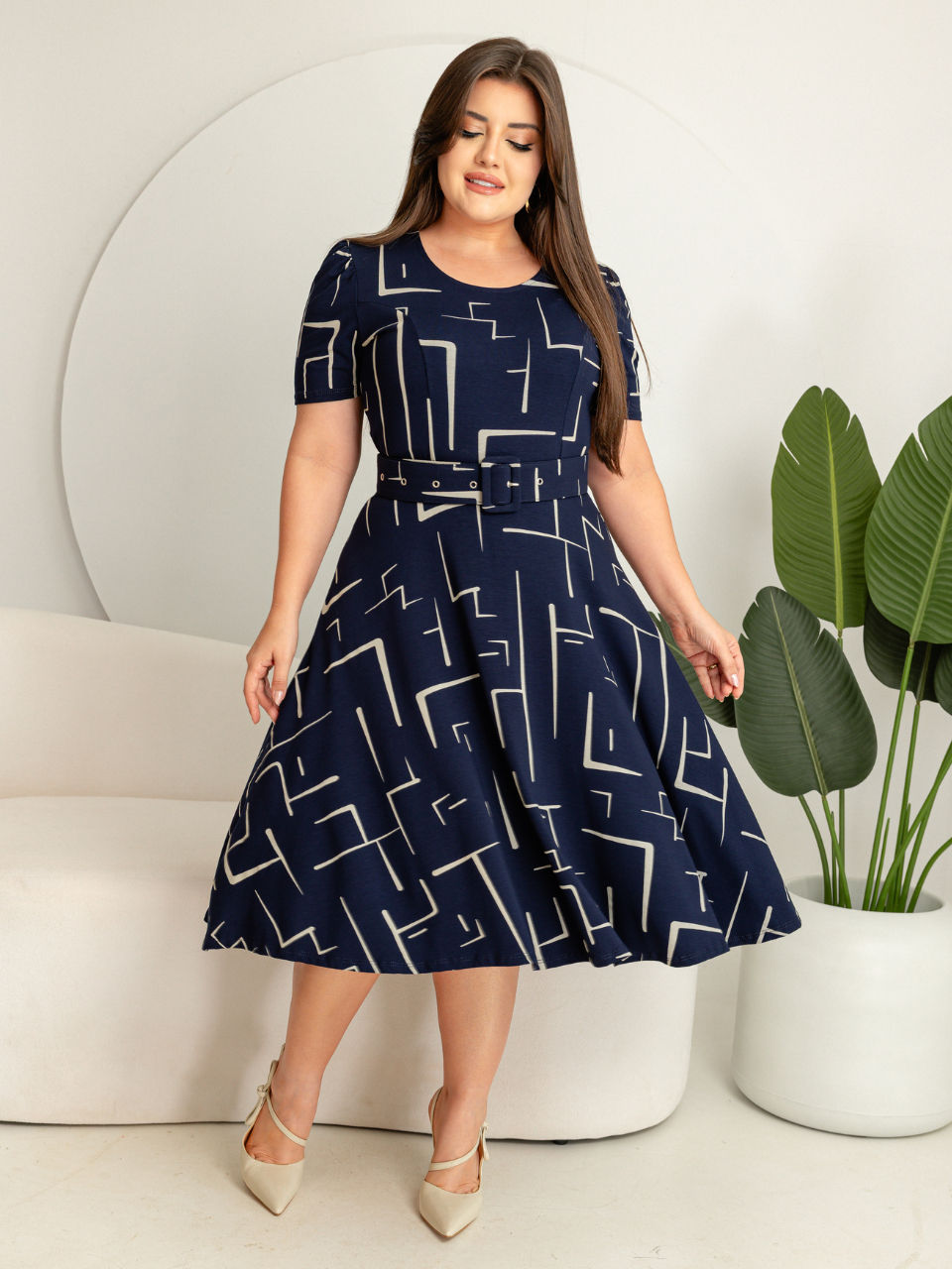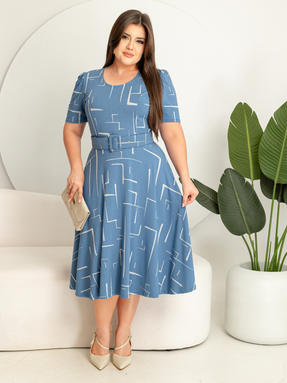 Vestido com cinto midi saia rodada godê manga curta decote redondo viscolycra com estampa.