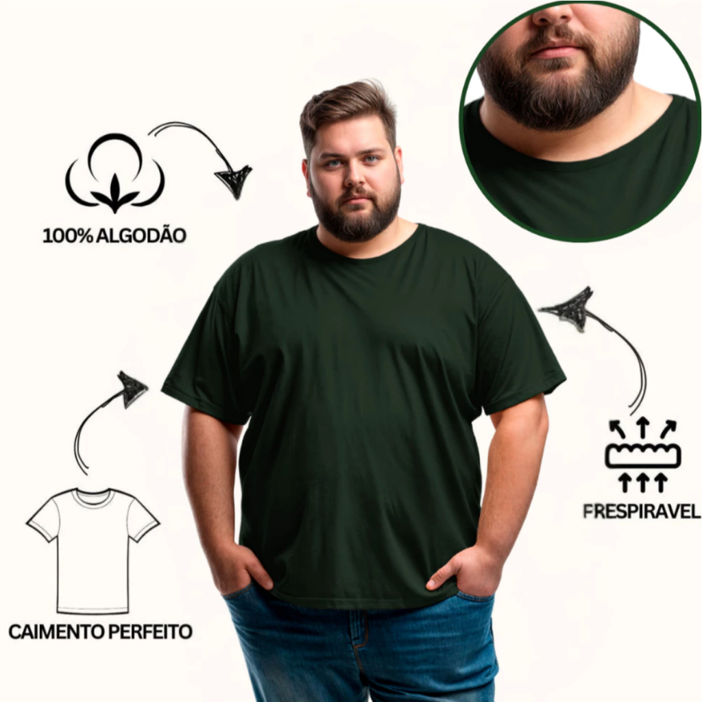 Camiseta Masculina Plus Size G1 ao G8 100% Algodão Fio 30.1 Penteado Confortável