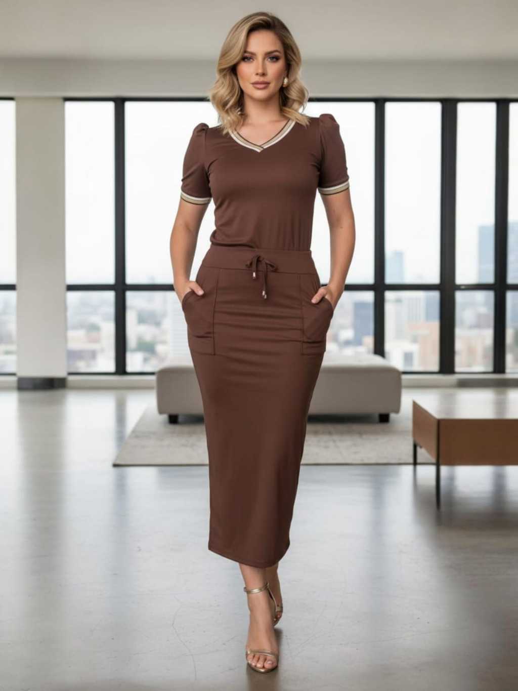 Conjunto Feminino Blusa Manga Bufante e Saia Midi Com Fendas laterais