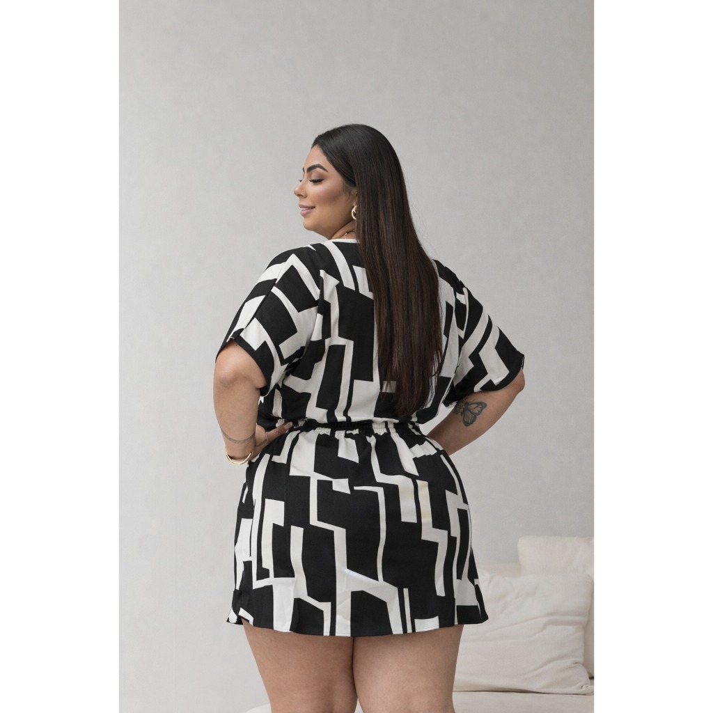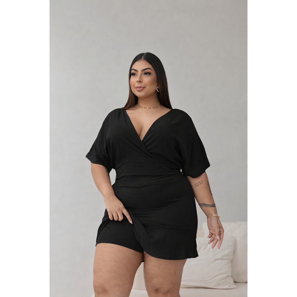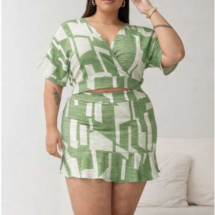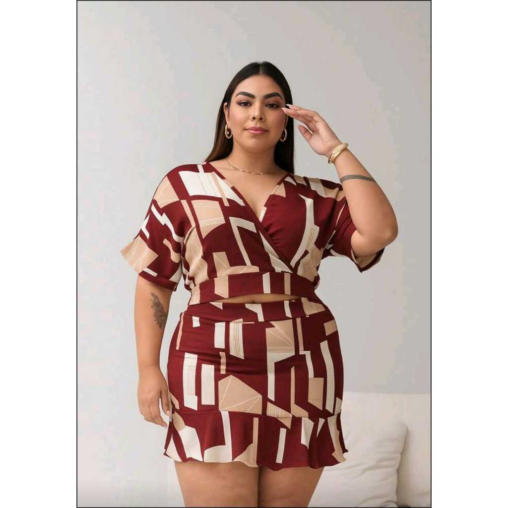 Conjunto Feminino Curvy Plus Size Croped Transpassado e Short Saia Cintura com elastico Nas Costas
