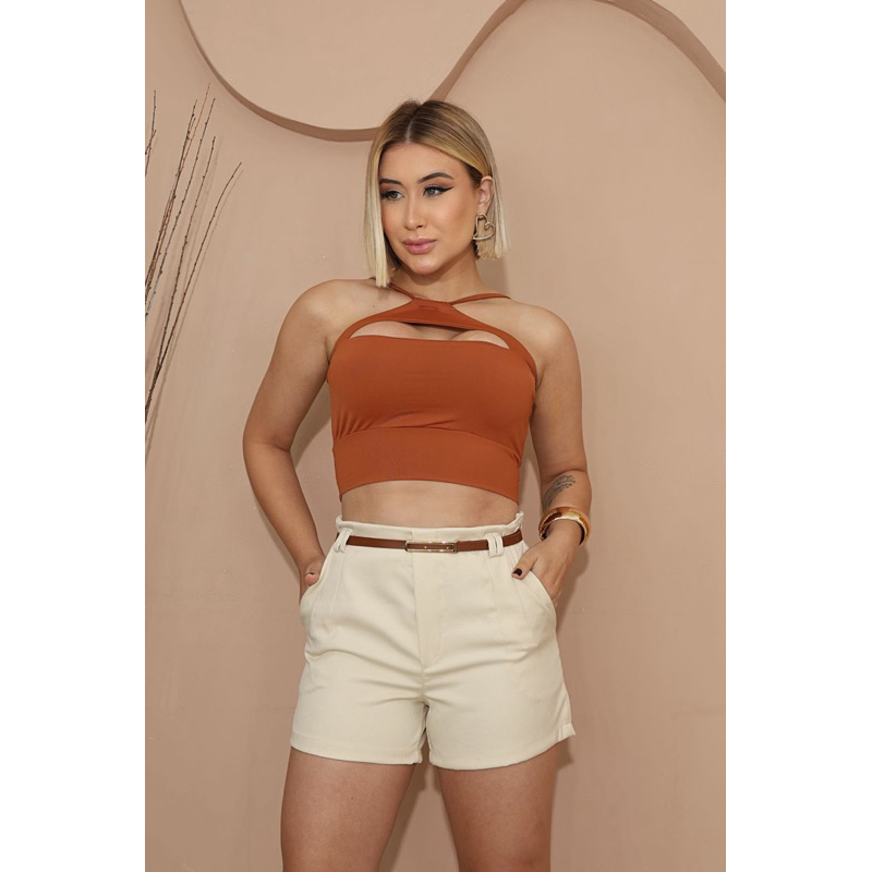 Short alfaiataria social feminino com cinto zíper lateral