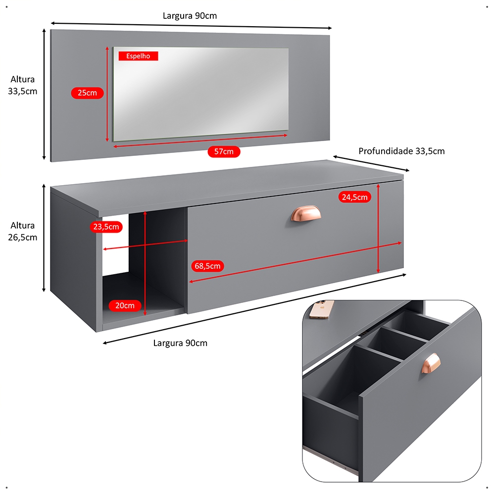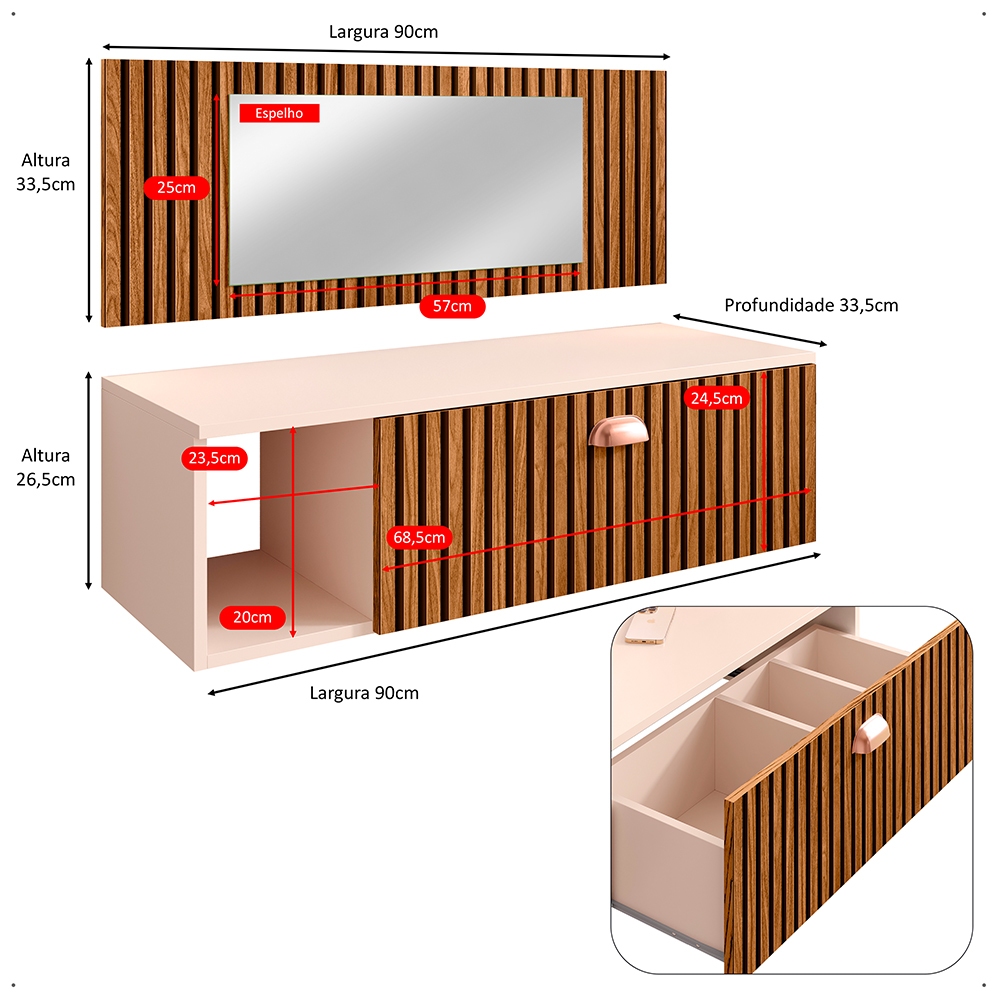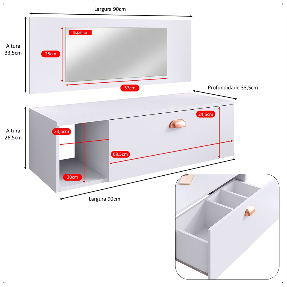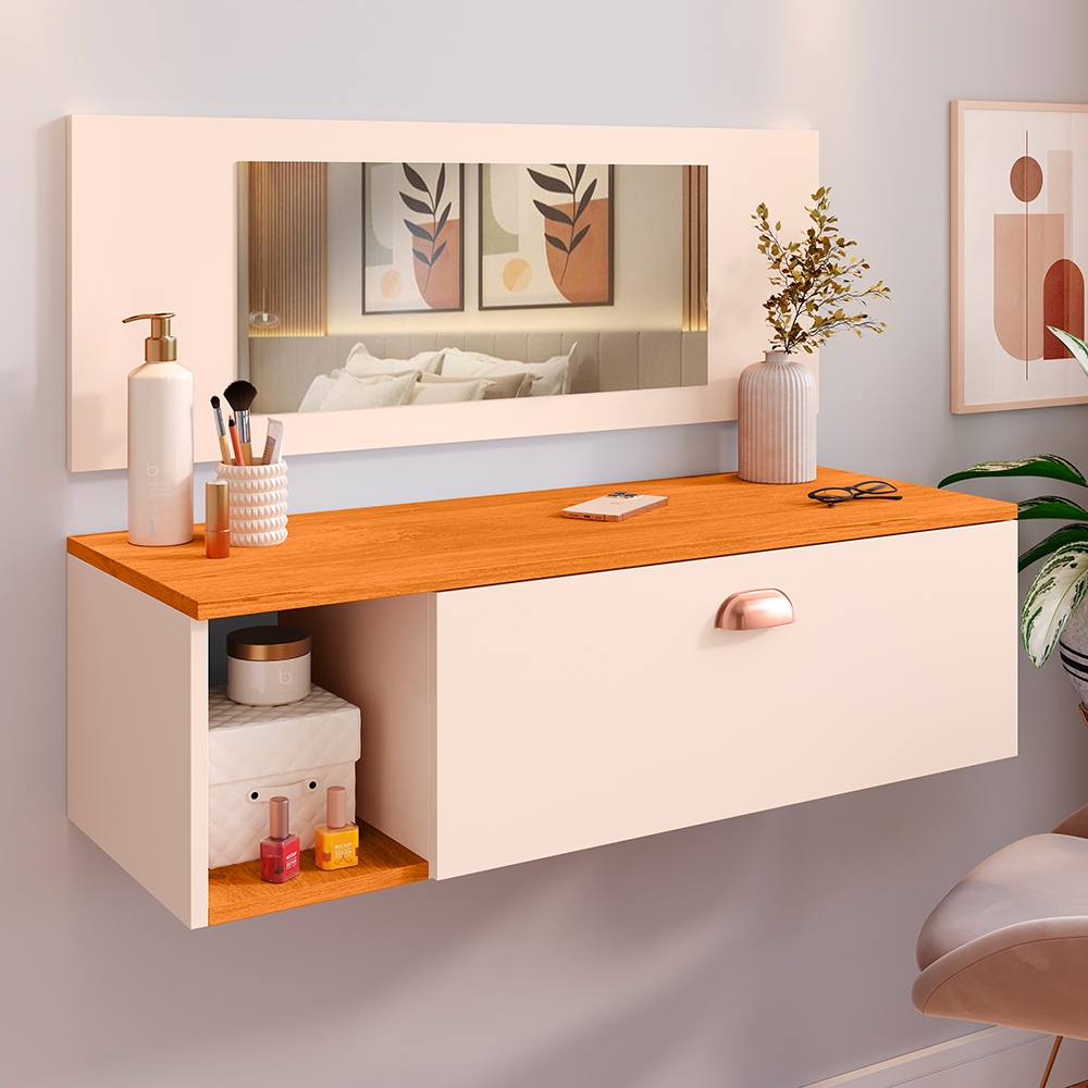 Penteadeira Suspensa Make Up COM OU SEM Espelho, Gaveta, Nicho, Divisória, Puxador Concha Dia dos Namorados