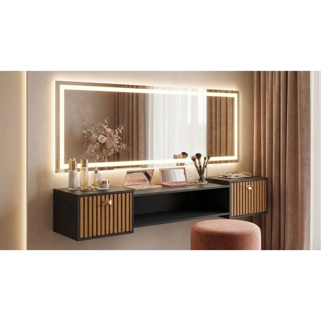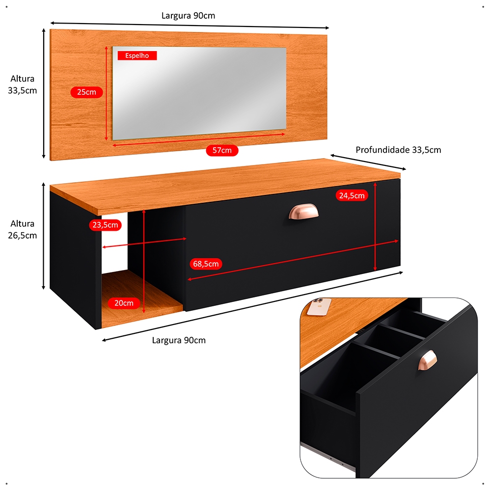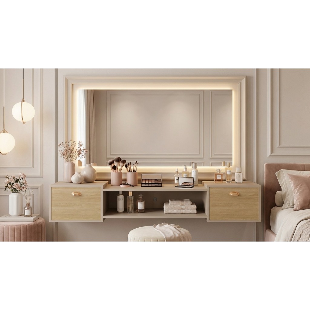 Penteadeira Suspensa Make Up COM OU SEM Espelho, Gaveta, Nicho, Divisória, Puxador Concha Dia dos Namorados