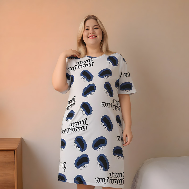 Vestido Feminino De Manga Curta Com Estampa De Desenho Animado Plus Size Fino Solto Roupa De Dormir